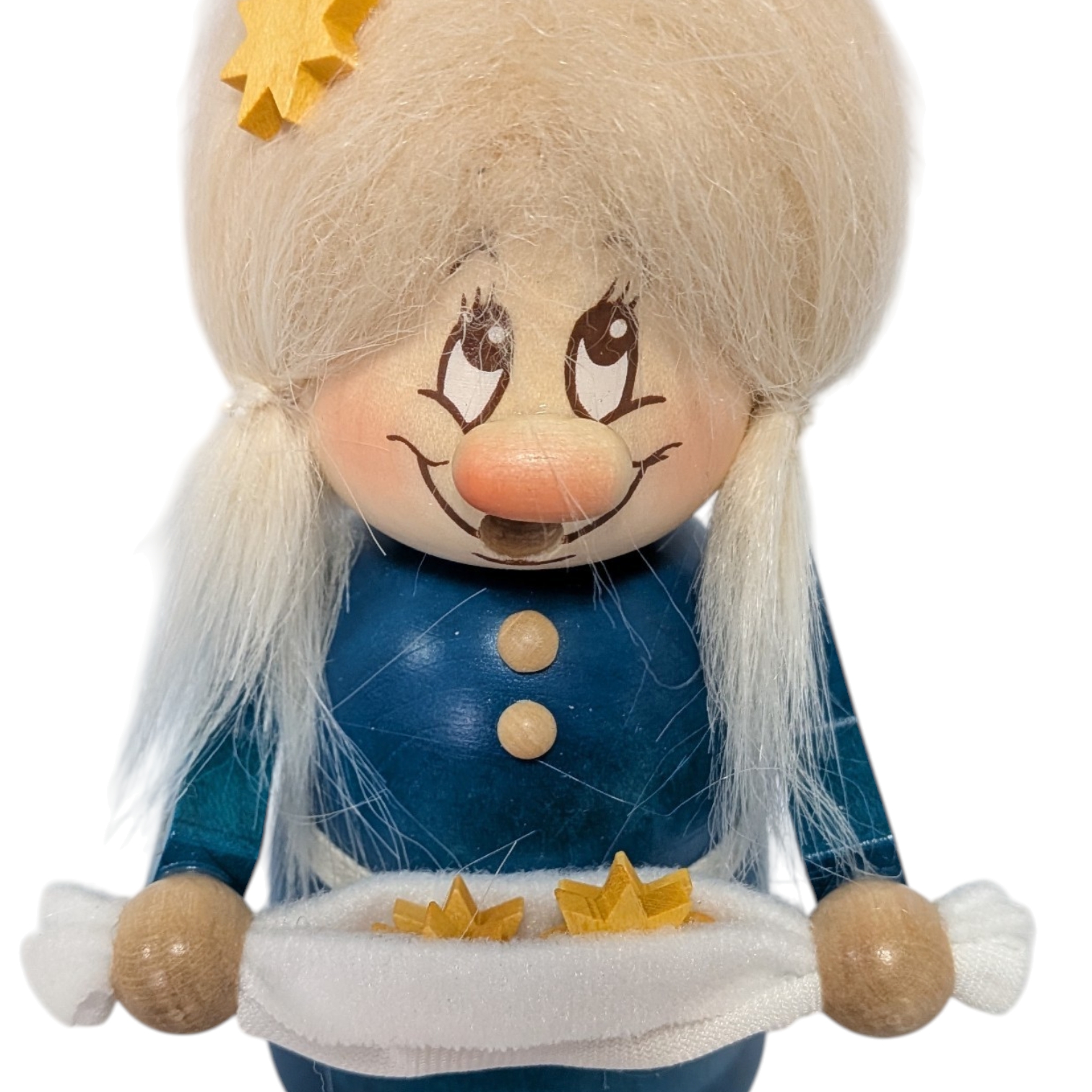 Sterntaler has a friendly face with large eyes, rosy cheeks, and a small bulbous nose. Her light, fluffy synthetic hair frames her face, giving her a cozy, fairytale-like appearance.