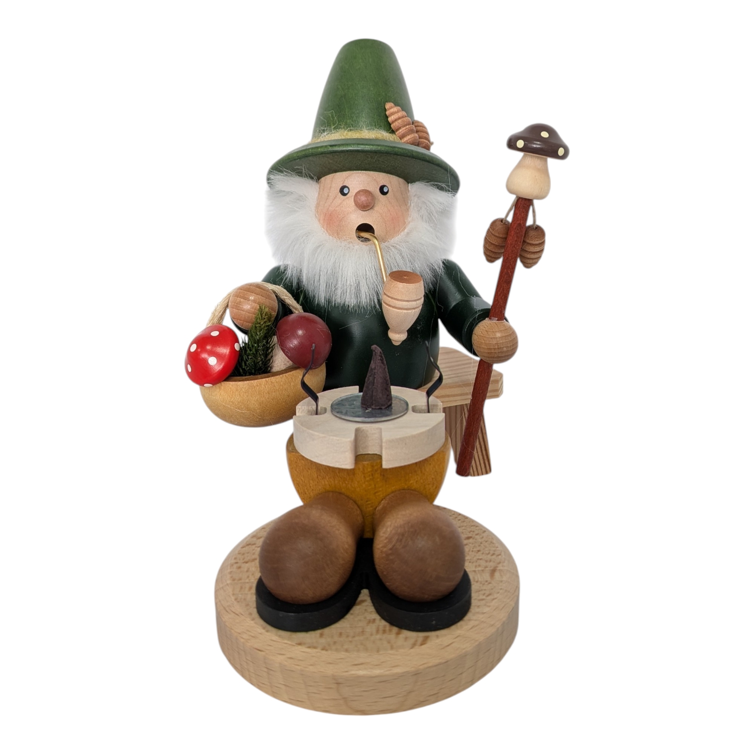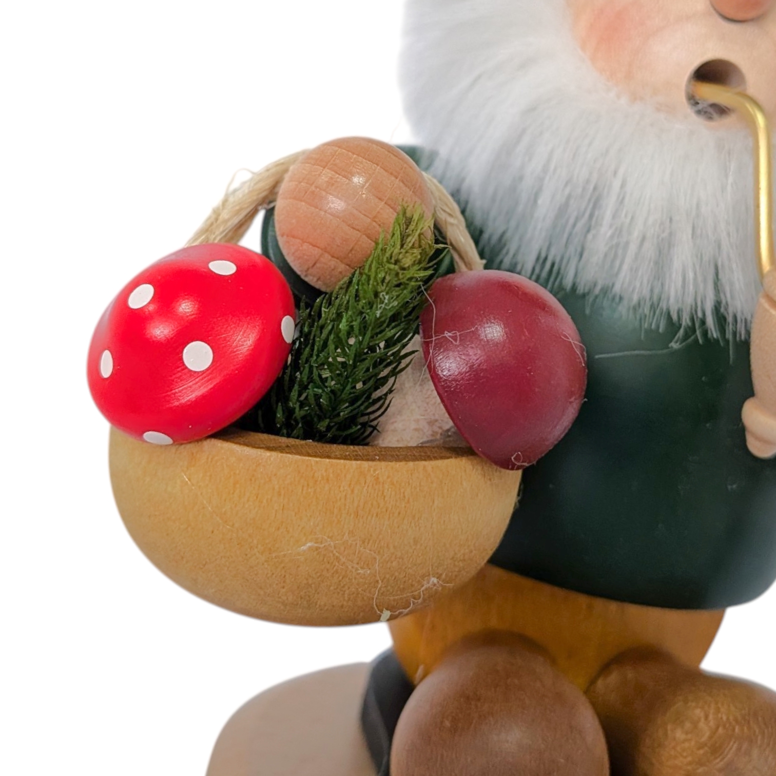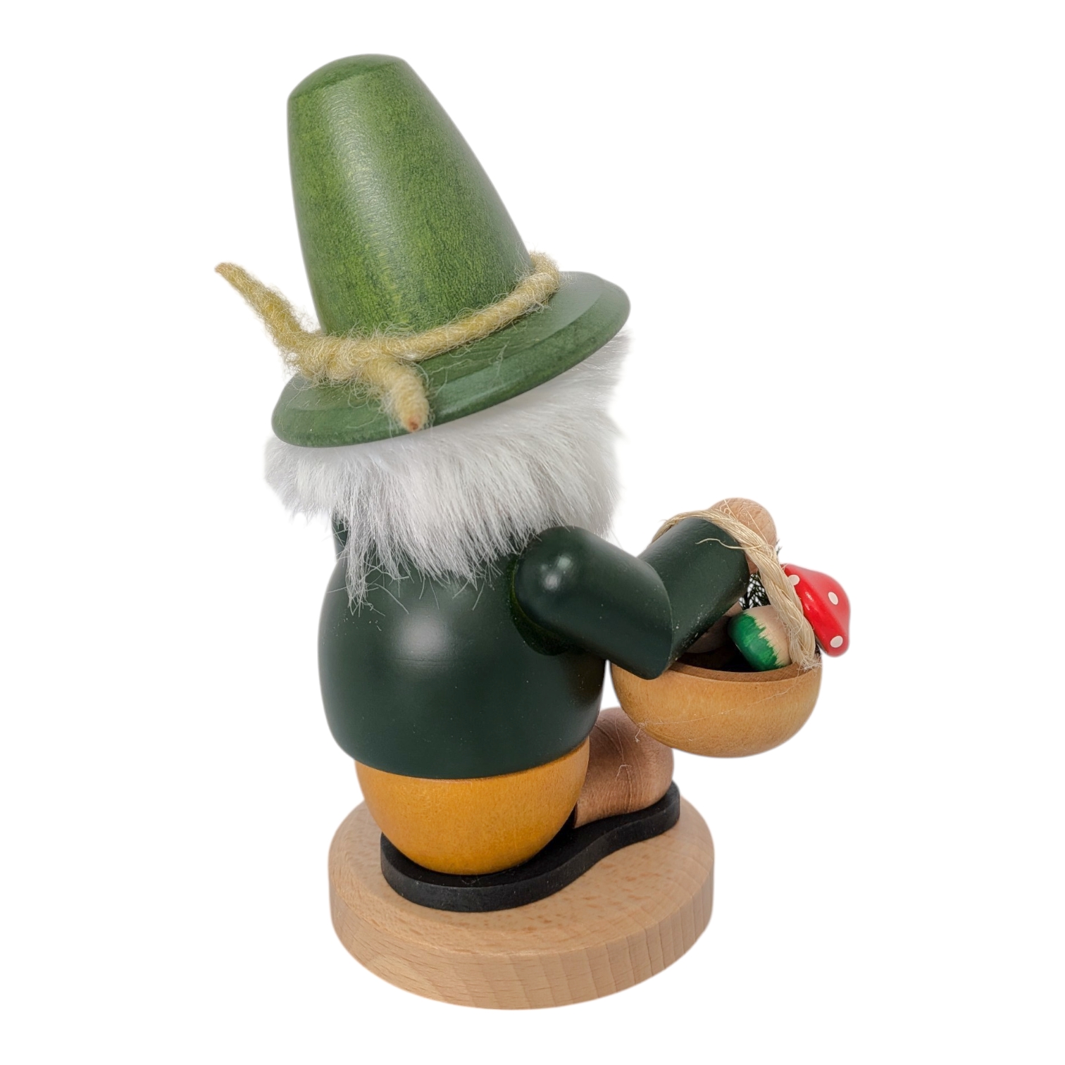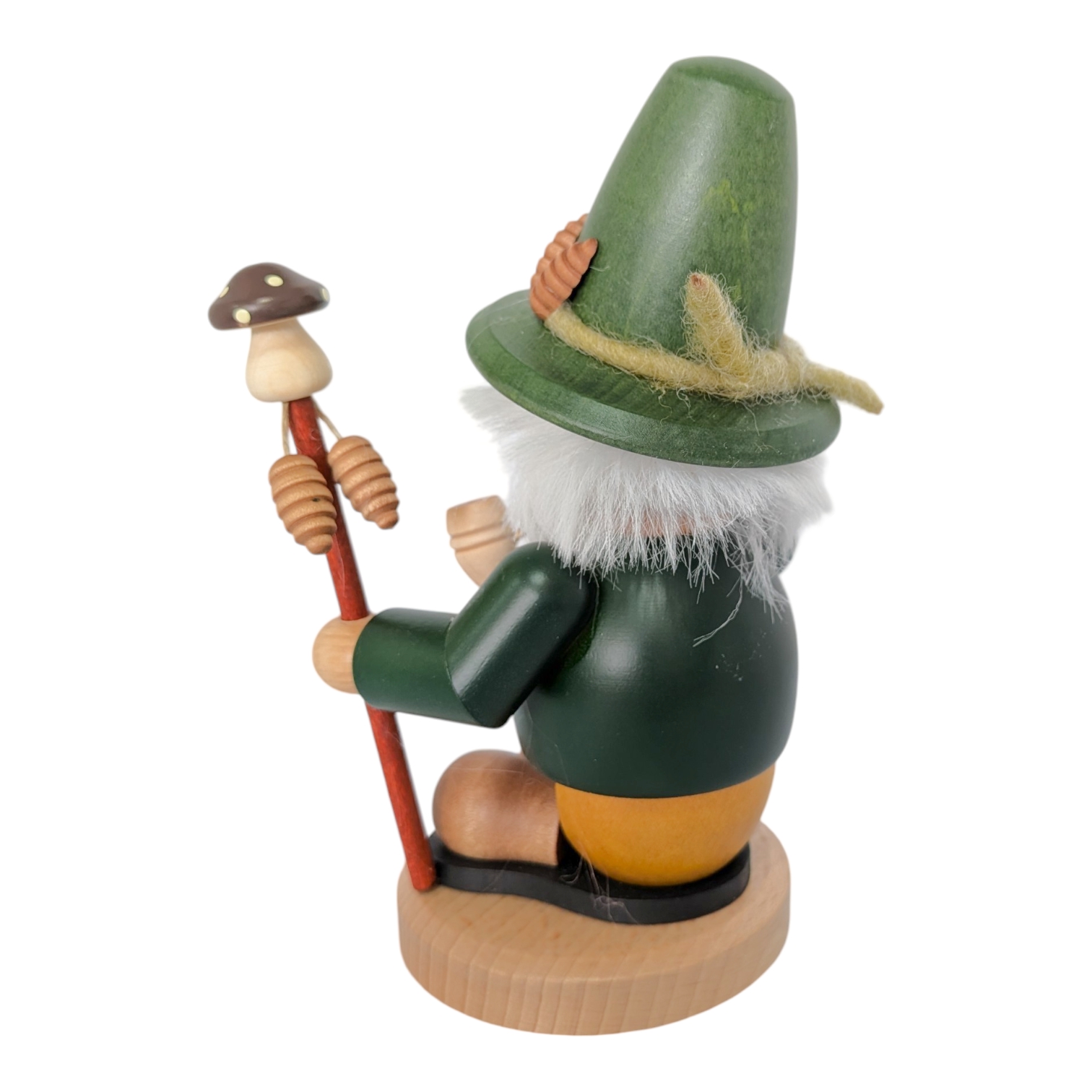 His short legs and sturdy, dark brown shoes ensure stability and complete the harmonious overall look. Beyond its decorative function, this woodsman is a genuine incense smoker: Inside, a small incense cone is placed, the smoke rising from his open mouth and thus bringing the figure to life in the traditional way. This woodsman combines Erzgebirge tradition with a humorous, nature-inspired design and is an ideal gift for nature lovers, mushroom hunters, and connoisseurs of high-quality wooden art.