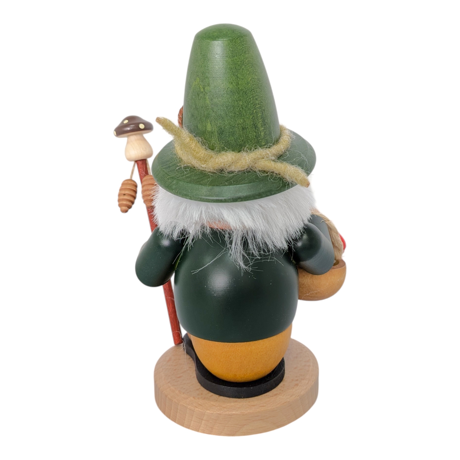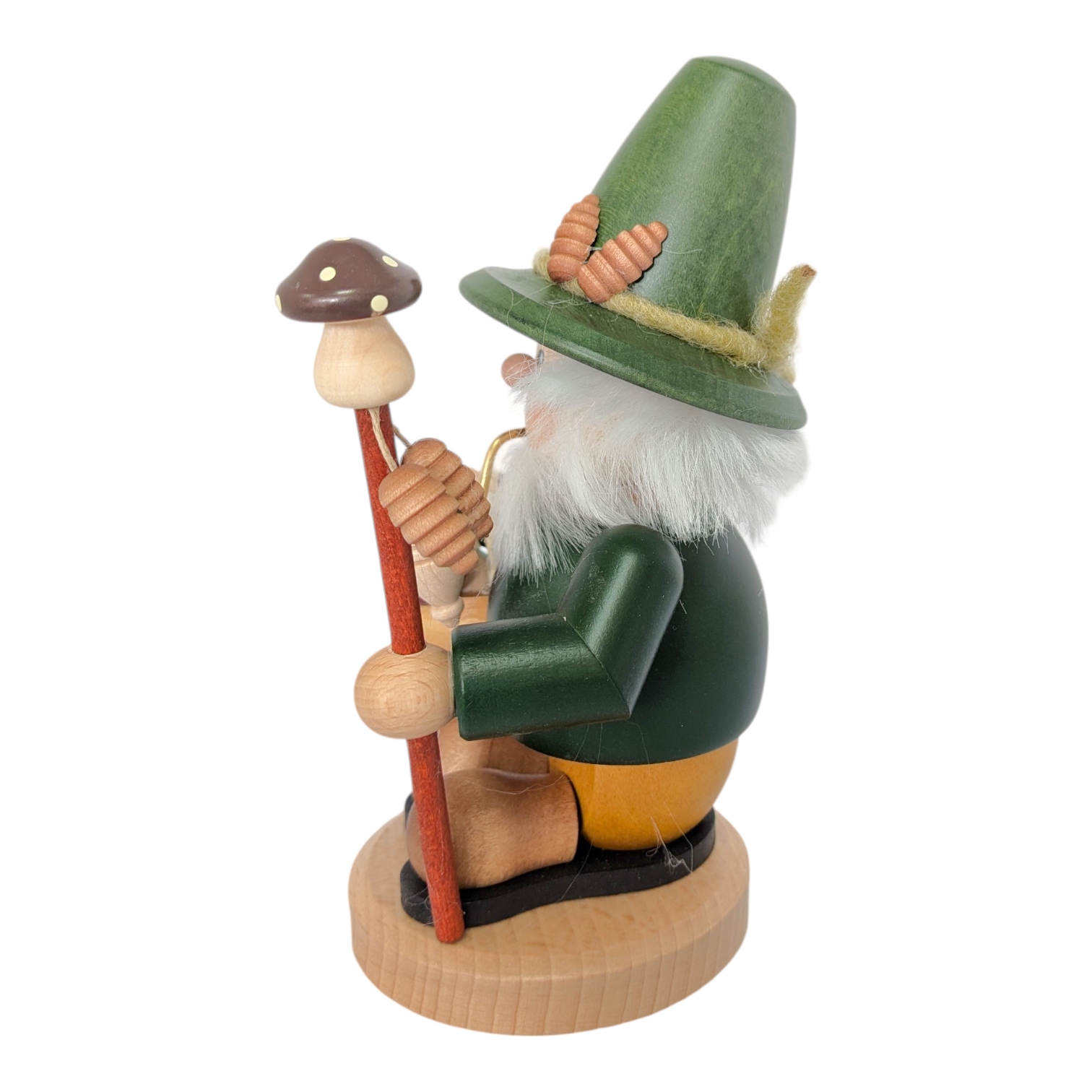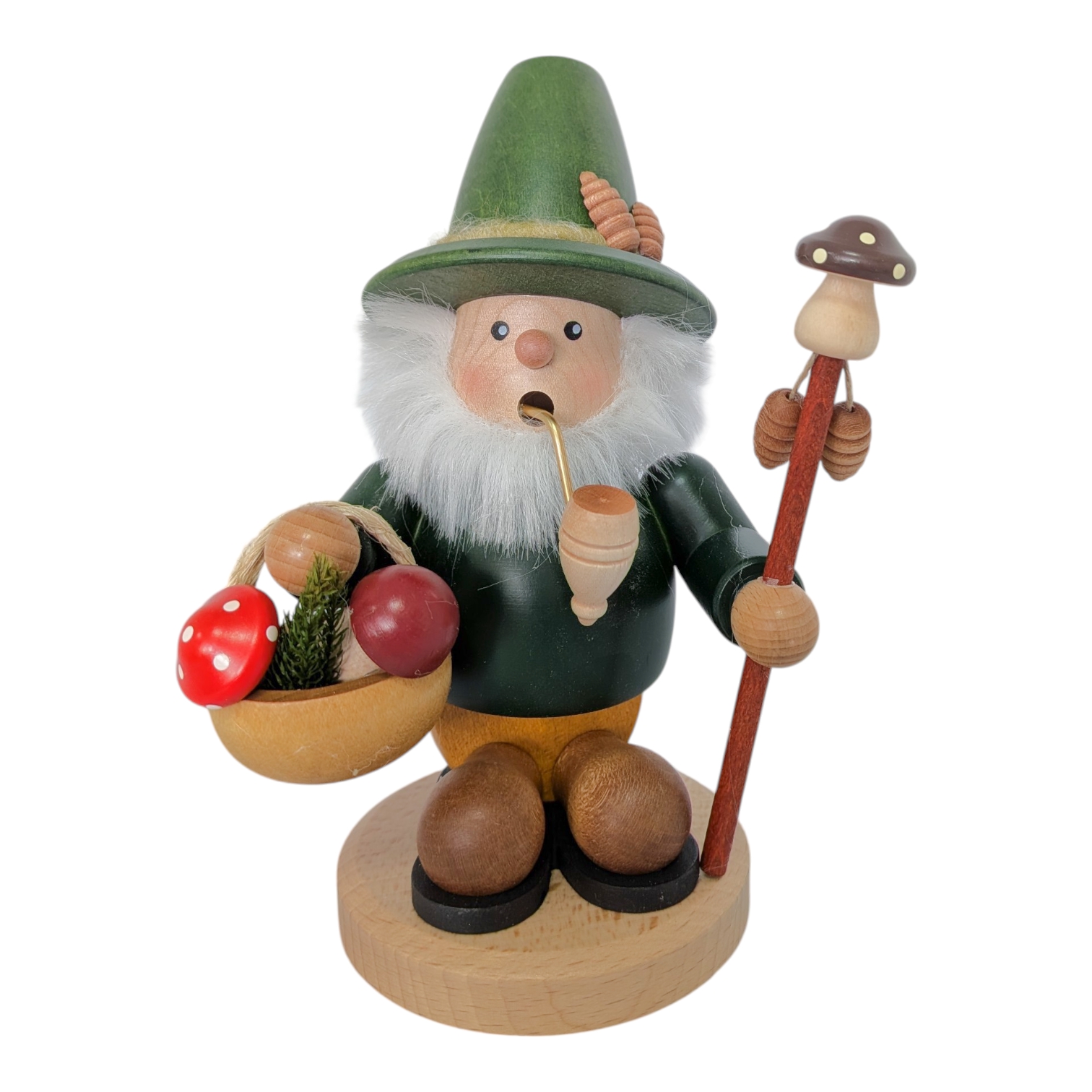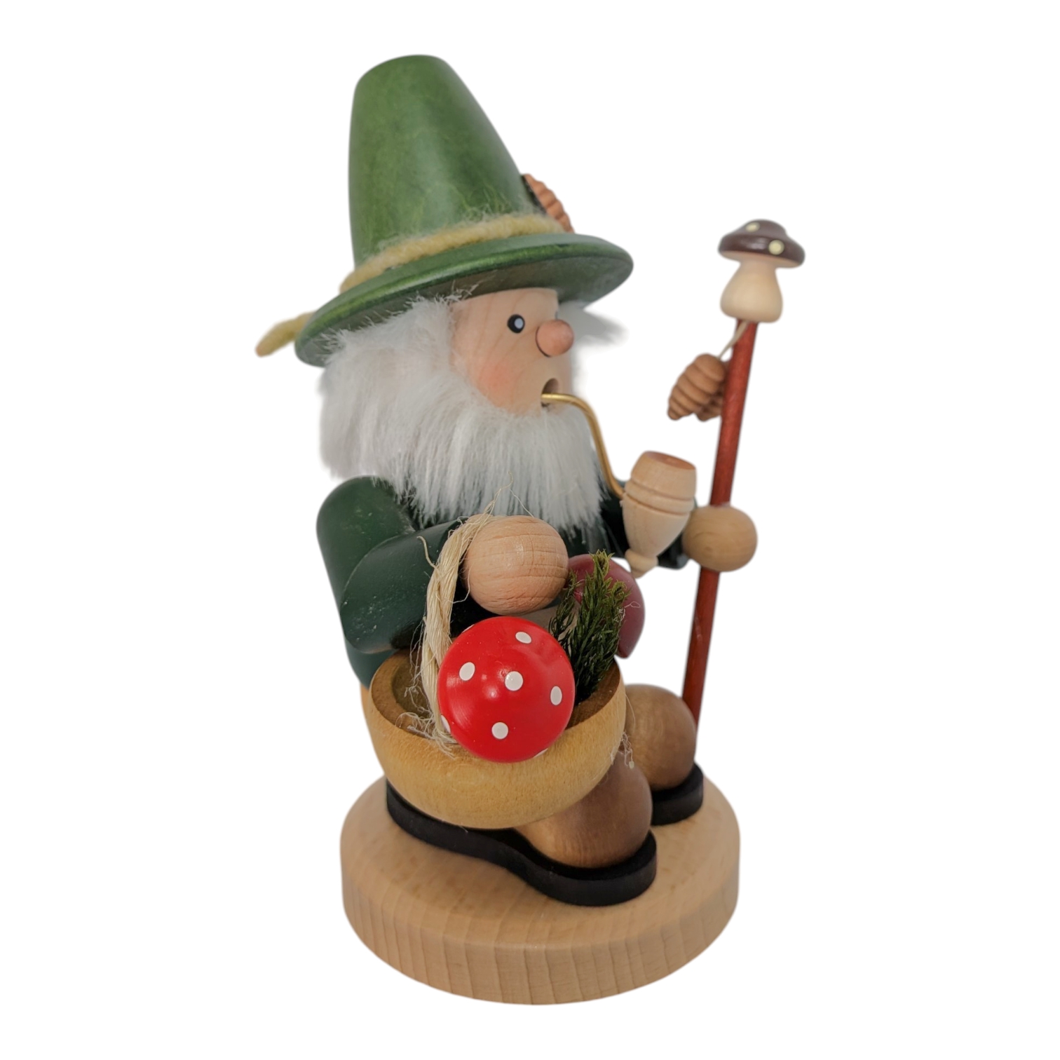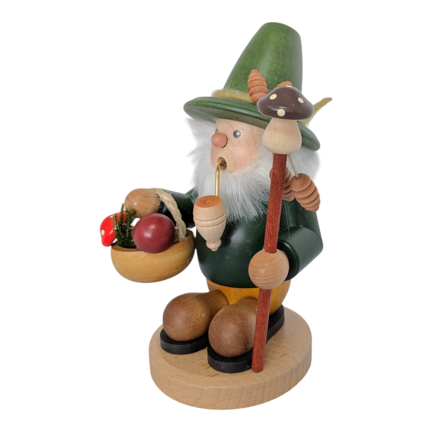 His short legs and sturdy, dark brown shoes ensure stability and complete the harmonious overall look. Beyond its decorative function, this woodsman is a genuine incense smoker: Inside, a small incense cone is placed, the smoke rising from his open mouth and thus bringing the figure to life in the traditional way. This woodsman combines Erzgebirge tradition with a humorous, nature-inspired design and is an ideal gift for nature lovers, mushroom hunters, and connoisseurs of high-quality wooden art.