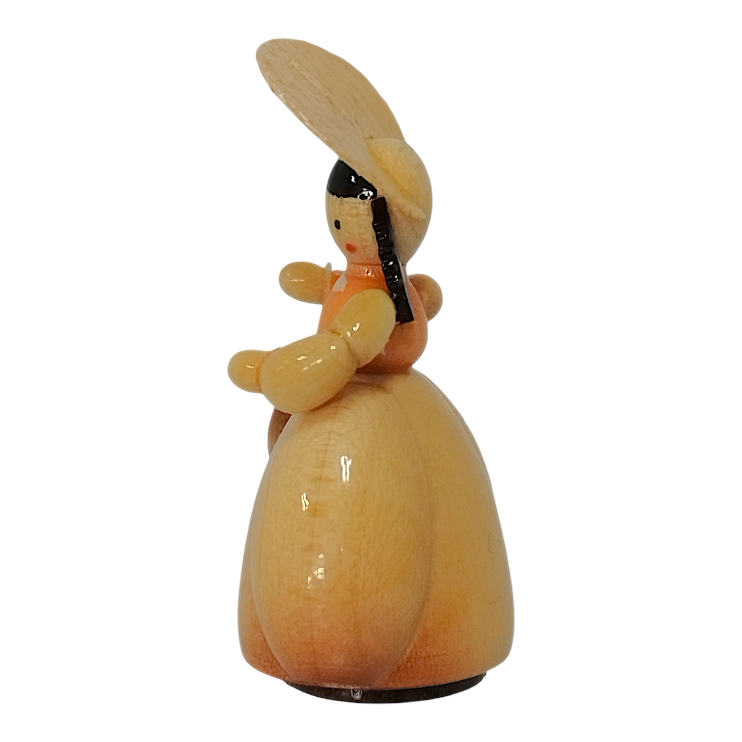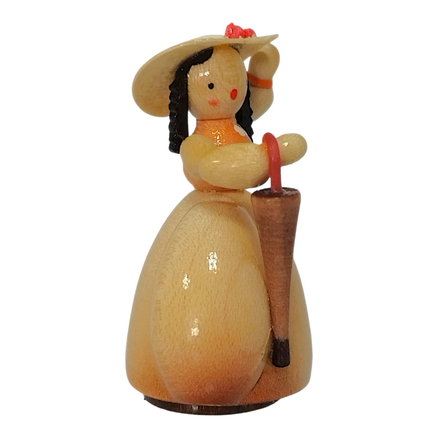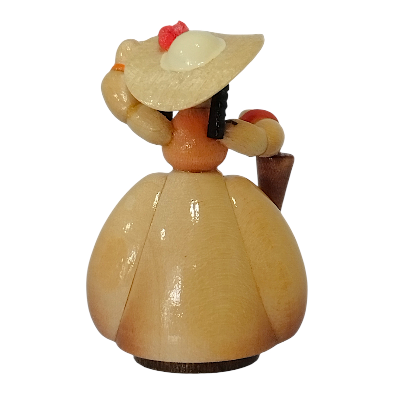 The friendly face of each lady in a hat exudes a refined calm and serenity. With two delicate dots around her eyes and a tiny red mouth, she possesses a charmingly childlike quality. Her dark hair is neatly styled beneath her hat, highlighting the meticulous attention to detail characteristic of Erzgebirge craftsmanship. Each figure is a unique, hand-painted piece, perfectly embodying the spirit of the Biedermeier era and creating an atmosphere of idyllic tranquility and enduring beauty.