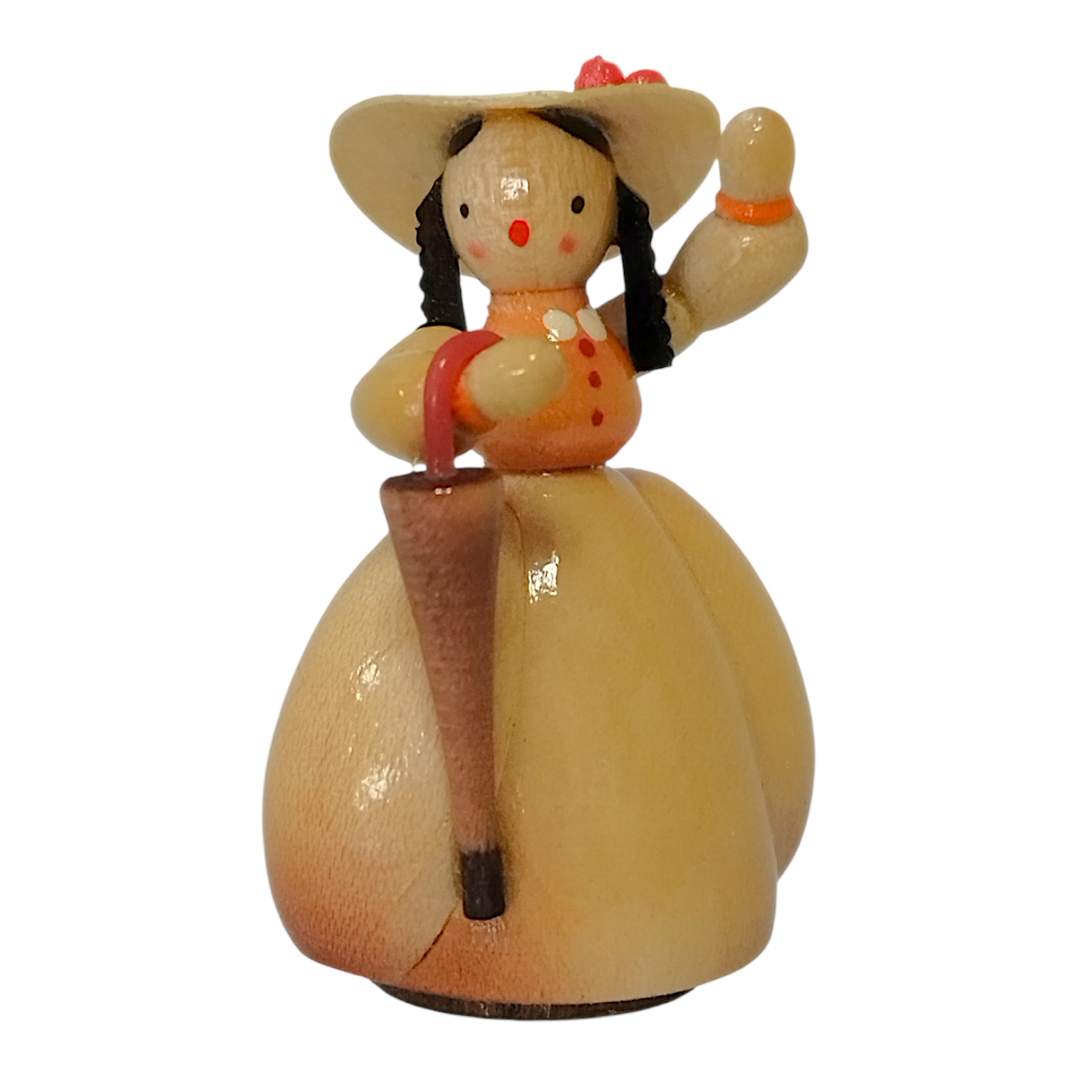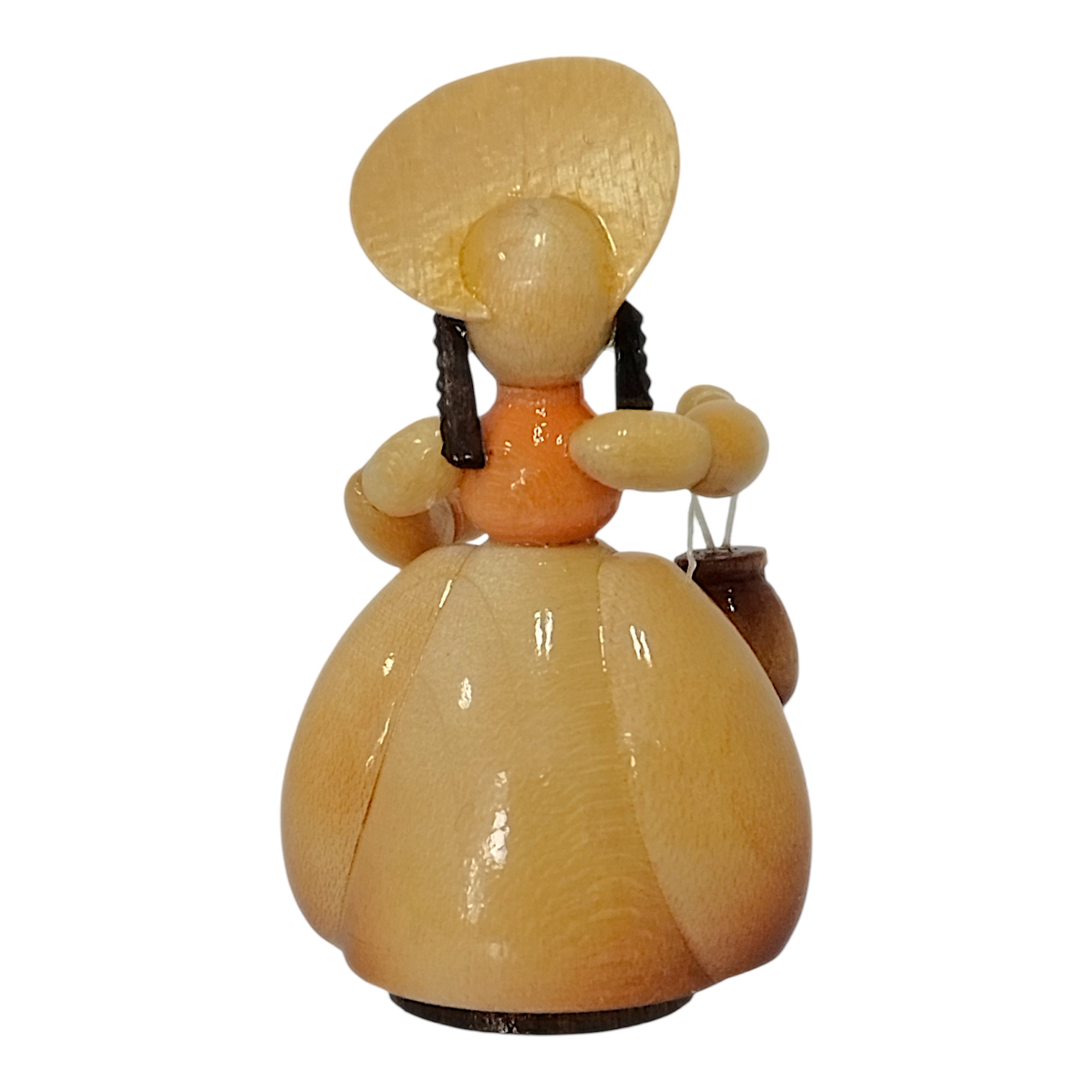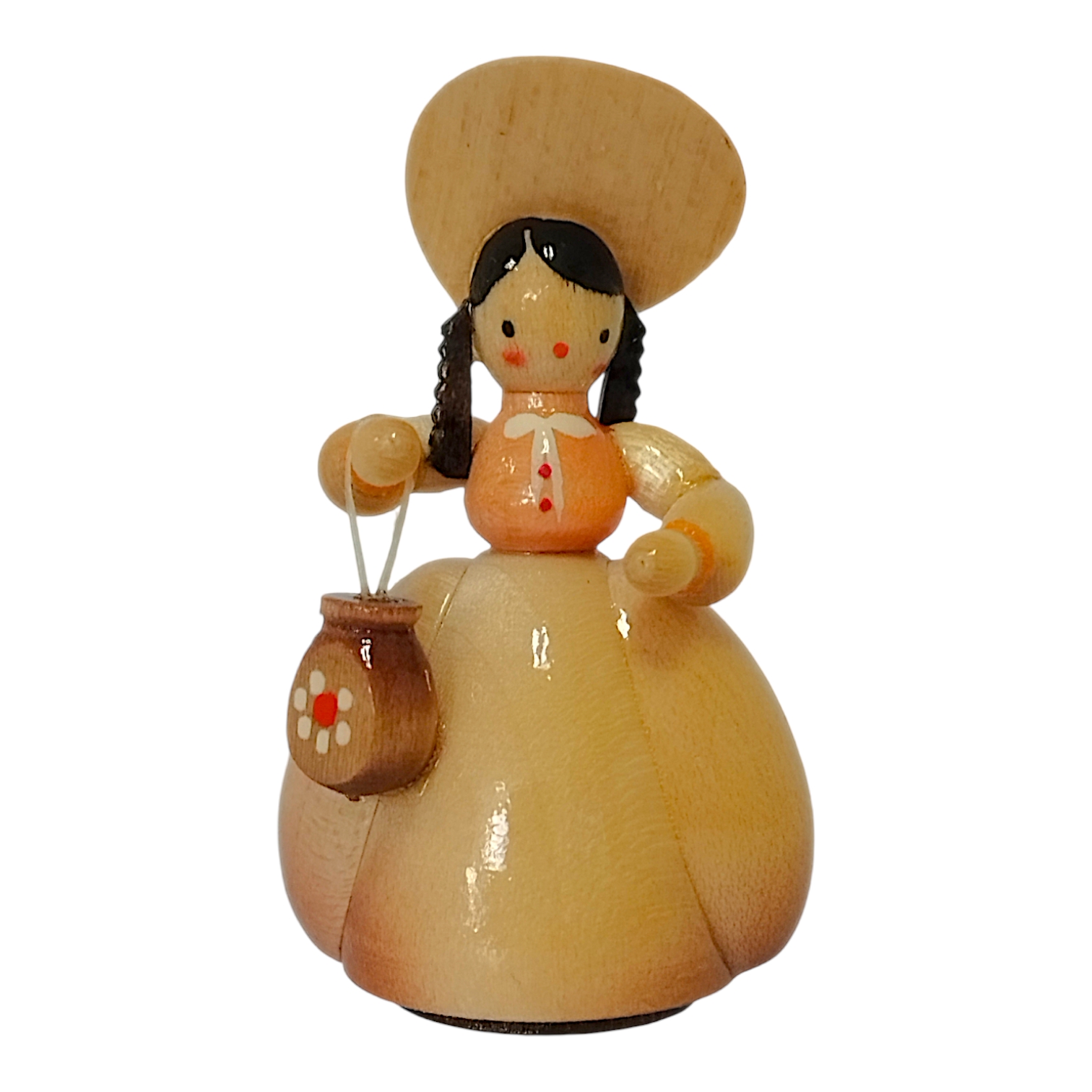 The friendly face of each lady in a hat exudes a refined calm and serenity. With two delicate dots around her eyes and a tiny red mouth, she possesses a charmingly childlike quality. Her dark hair is neatly styled beneath her hat, highlighting the meticulous attention to detail characteristic of Erzgebirge craftsmanship. Each figure is a unique, hand-painted piece, perfectly embodying the spirit of the Biedermeier era and creating an atmosphere of idyllic tranquility and enduring beauty.