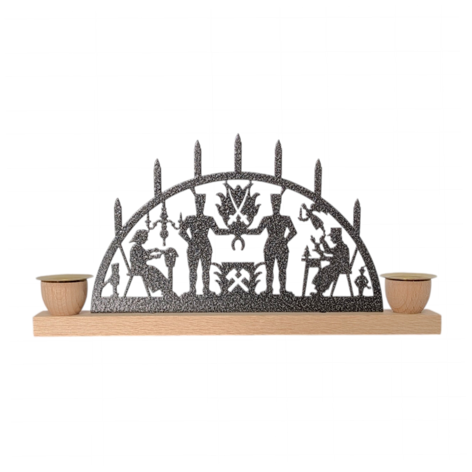 The intricate arch design tells a story, the story of the people who have shaped and influenced the Ore Mountains over centuries. At its center stand proud miners in their traditional attire, a silent monument to the region’s arduous yet proud mining heritage. To the right, the design depicts a toymaker at work – a loving reference to the world-renowned wooden toy craftsmanship of the Ore Mountains, which continues to captivate buyers from around the globe. To the left sits a lacemaker, bringing the region’s centuries-old lace-making tradition to life with delicate threads and a steady hand. Three motifs, three crafts, one story – united in a single, handcrafted arch.