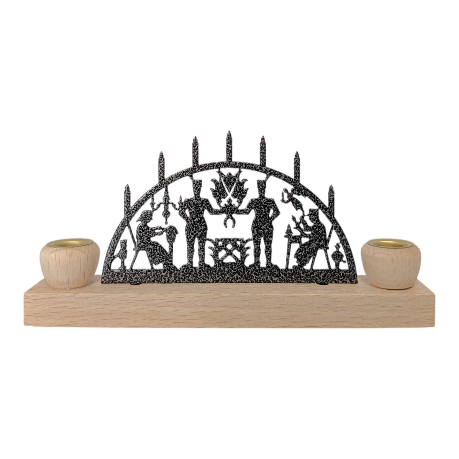 The delicate arch motif tells a story, the story of the people who have shaped and influenced the Ore Mountains over centuries. At its center stand proud miners in their traditional attire, a silent monument to the region’s arduous yet proud mining heritage. To the right, the motif depicts a toymaker at work – a loving reference to the world-renowned wooden toy craftsmanship of the Ore Mountains, which continues to captivate buyers from all over the world. To the left sits a lacemaker, bringing the region’s centuries-old lace-making tradition to life with delicate threads and a steady hand. Three motifs, three crafts, one story – united in a single handcrafted arch.