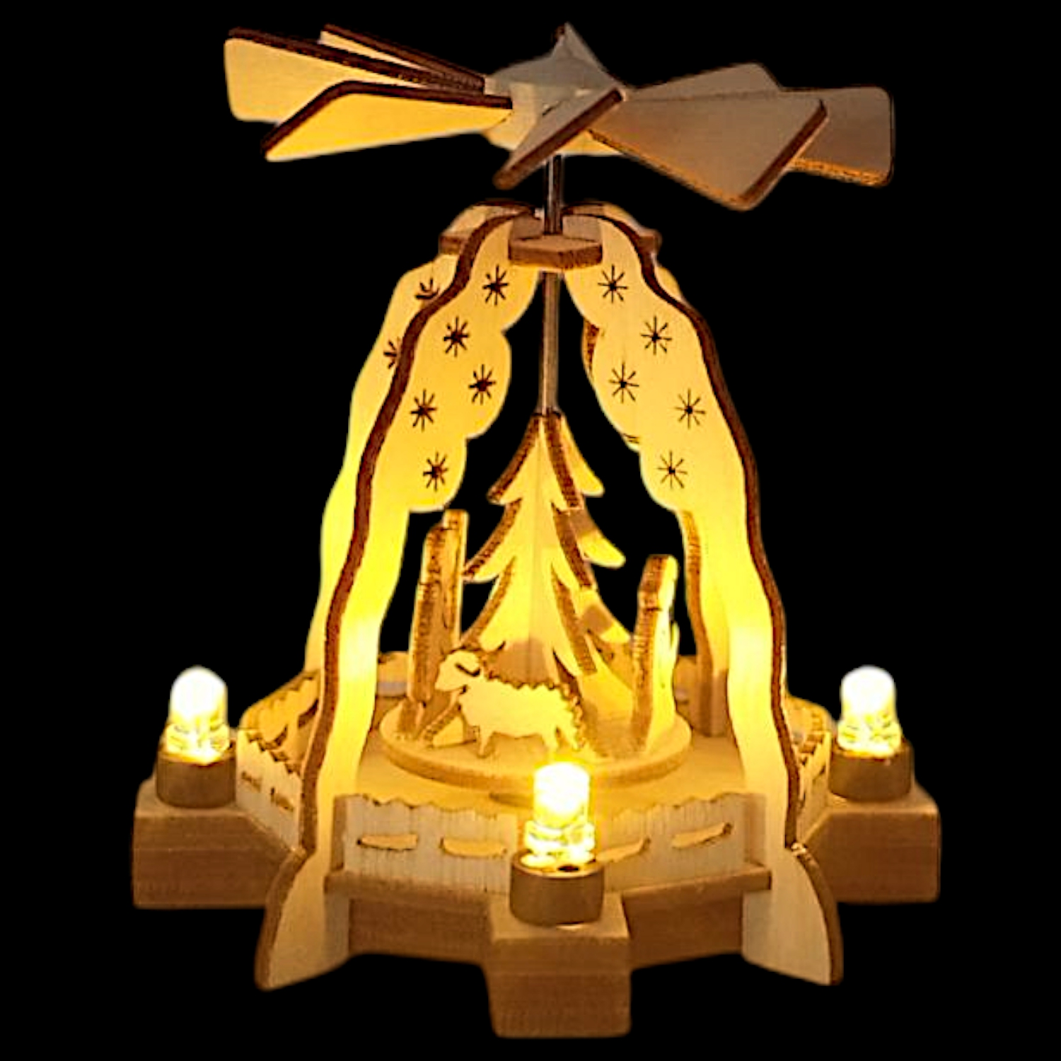 Made of light wood and designed with great attention to detail, the pyramid depicts the classic scene of the Holy Family: Mary, Joseph, the baby Jesus, and even a small sheep are lovingly crafted. The delicate structure with star-decorated sides creates a festive ambiance. Thanks to the electric lighting, the figures and the artistic design are beautifully showcased; an electrical cable with a transformer is required for operation.
