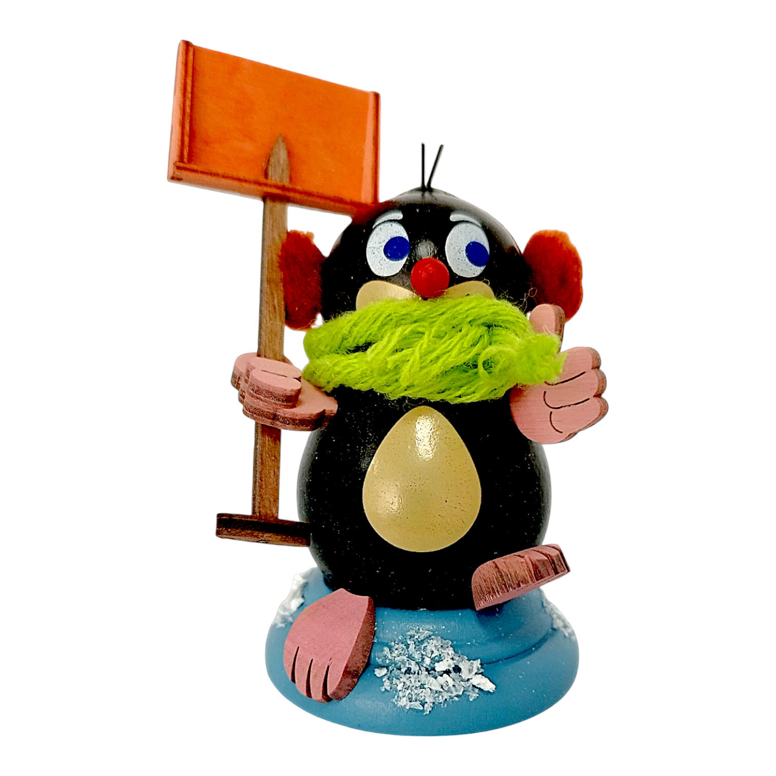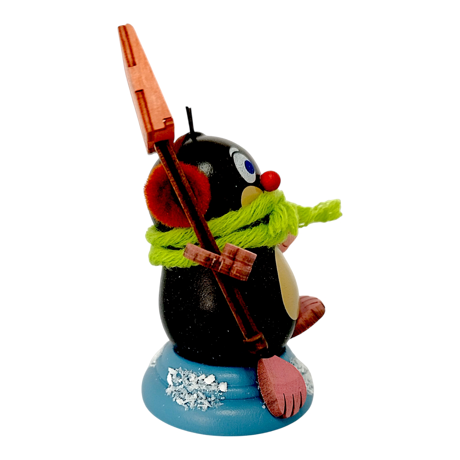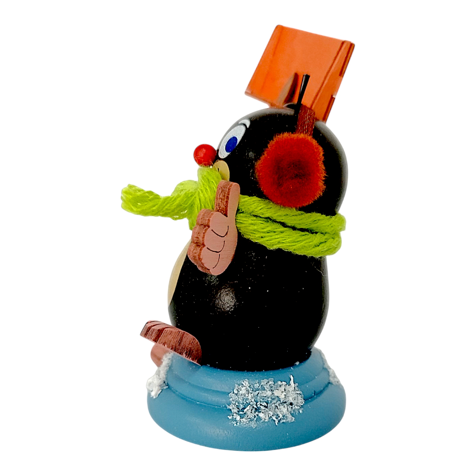 The grass-green glazed base, which symbolizes a molehill on the other models, is covered with a layer of glittering artificial snow on Egon’s. At a compact 7.5 cm tall, this wintry mole is a cheerful harbinger of winter, delighting collectors and lovers of beautiful wooden figurines alike. The combination of time-honored craftsmanship and modern design makes Egon a timeless object that instantly brings a smile to everyone who sees him. Because all the details are meticulously coordinated, this little winter figurine blends harmoniously into any Christmas or winter decoration, exuding a pleasant sense of groundedness.