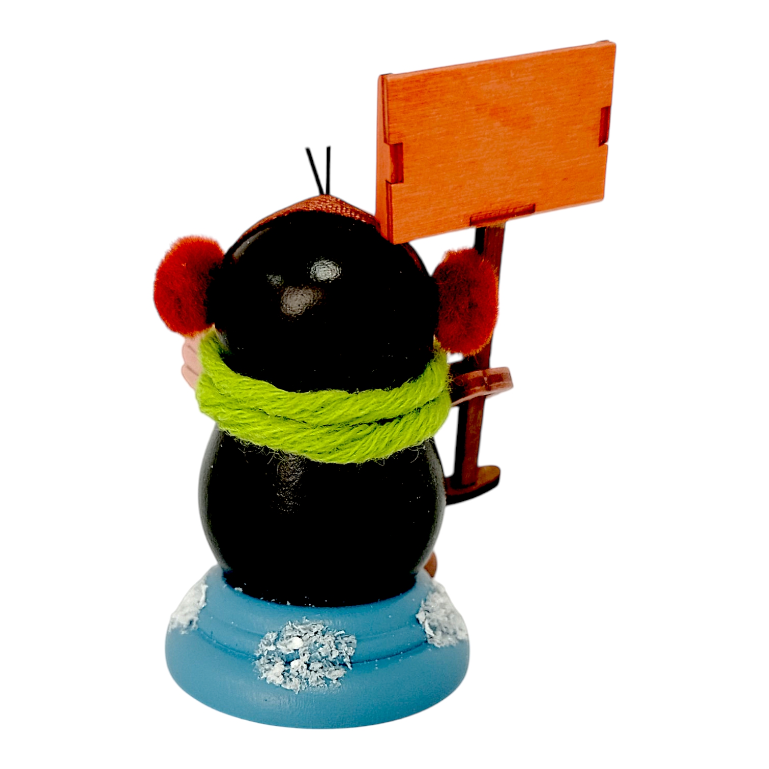In this winter edition, Egon is perfectly equipped for the cold season. He wears cozy, bright red plush earmuffs and a thick, light green wool scarf to warm his friendly face. In his left paw, Egon proudly holds a large, orange wooden sign on a wooden stick. This sign offers space for a personal inscription, such as a name or a short greeting. Egon cheerfully raises his right paw in a thumbs-up gesture. The use of high-quality, certified woods and saliva-resistant paints underscores the value of this charming companion.