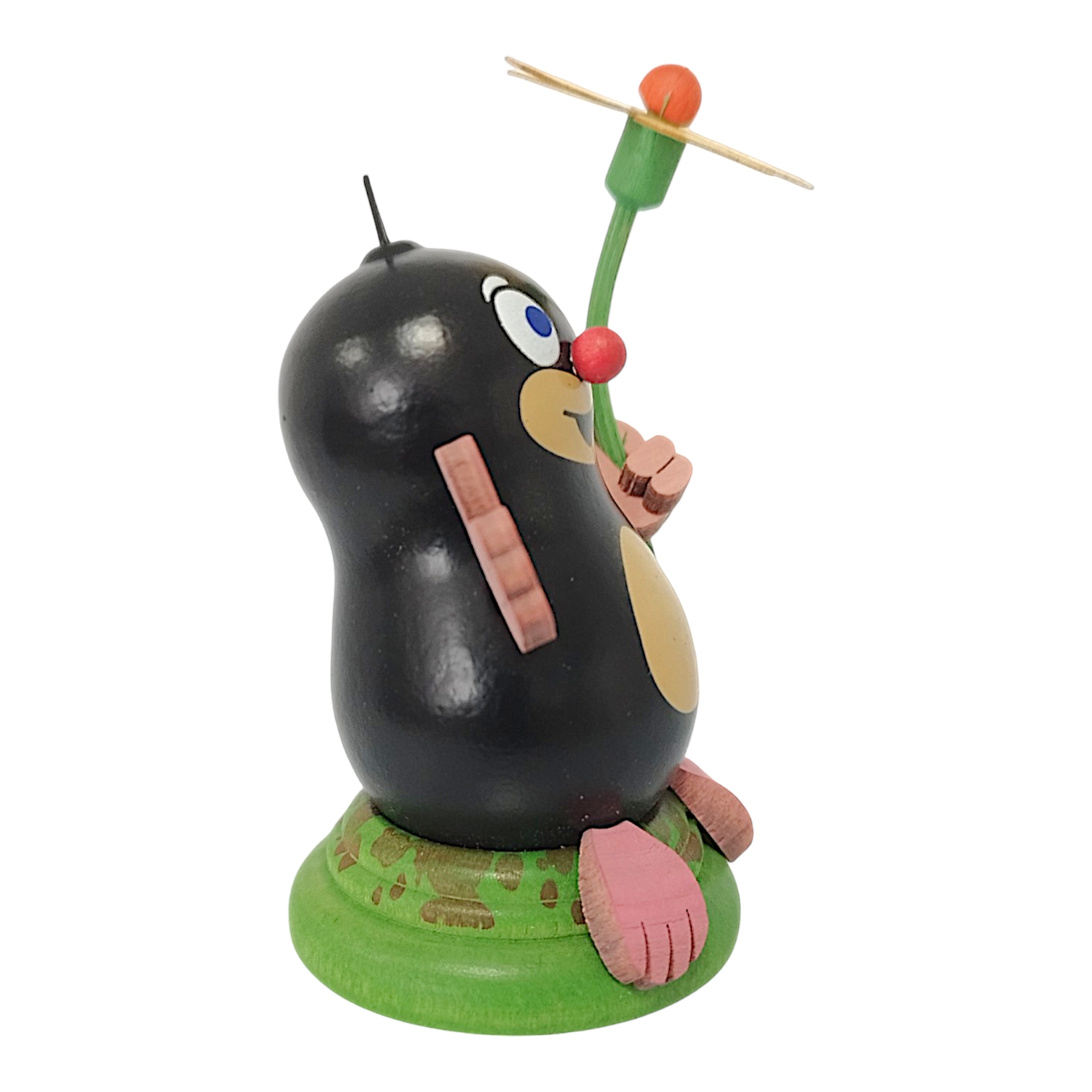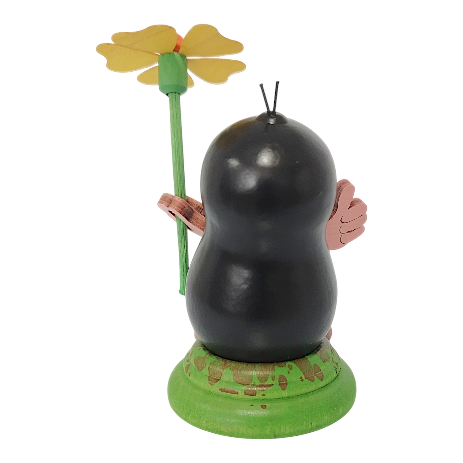 Herbert stands firmly on a grass-green glazed base, designed to resemble a small mound of earth. This design not only provides a secure stand but also blends harmoniously into any décor. At a compact 7.5 cm tall, Herbert is a cheerful companion that will delight collectors and lovers of wooden figurines alike.