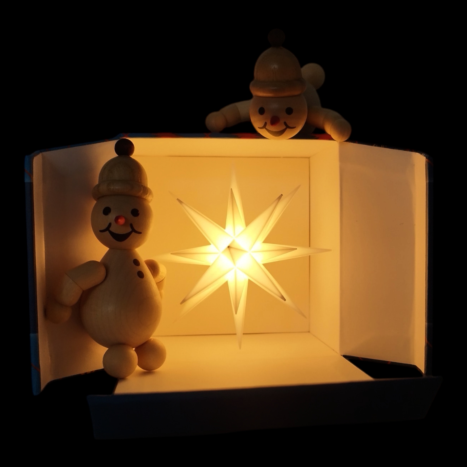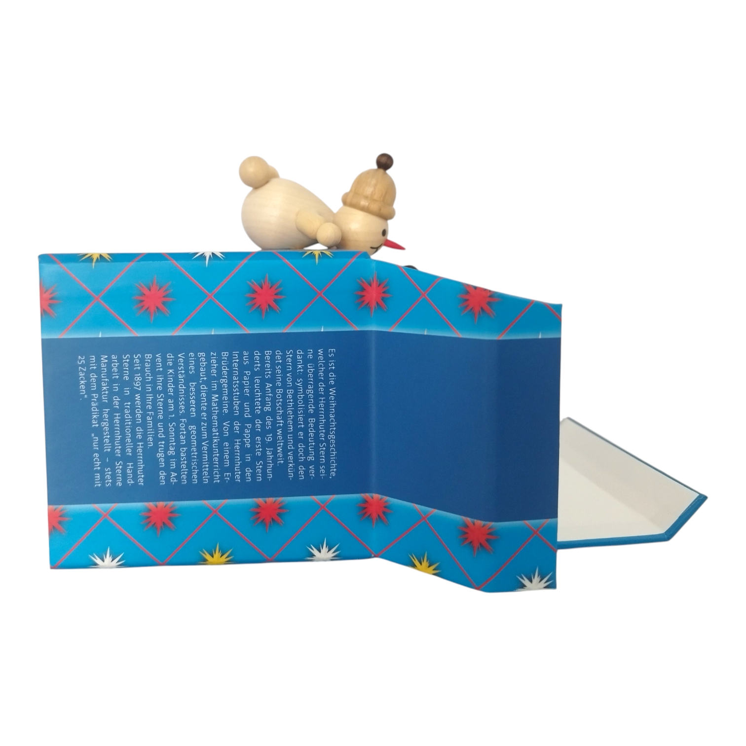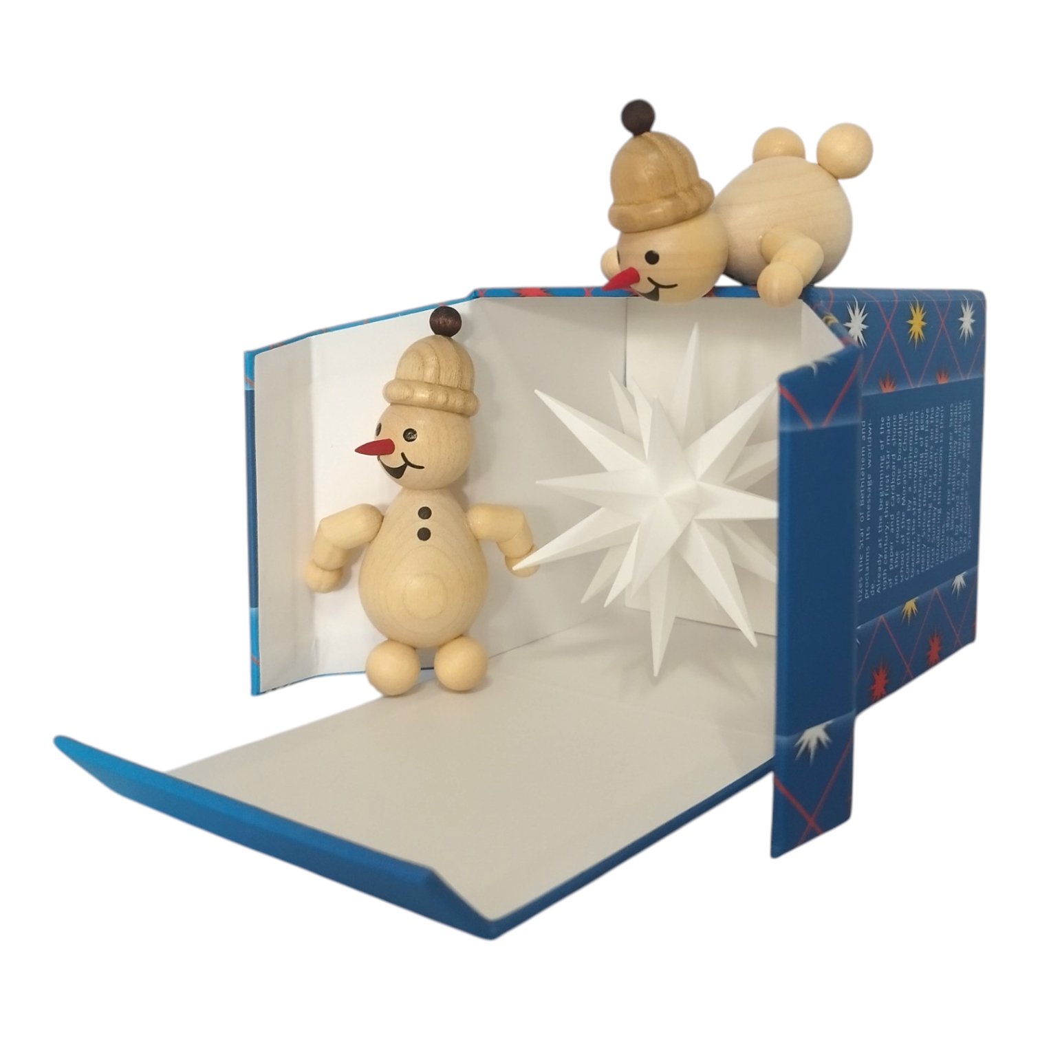 A charming scene unfolds as two snowmen from the Volkmar Wagner woodturning workshop curiously unwrap a Moravian star miniature star – a creation of three traditional Saxon companies. The typical packaging of the Herrnhut star takes center stage, deceptively realistic – crafted using an almost forgotten art: fine cardboard box making. Richter Kartonagen GmbH from Chemnitz is an expert in this field and a partner in this collaboration.