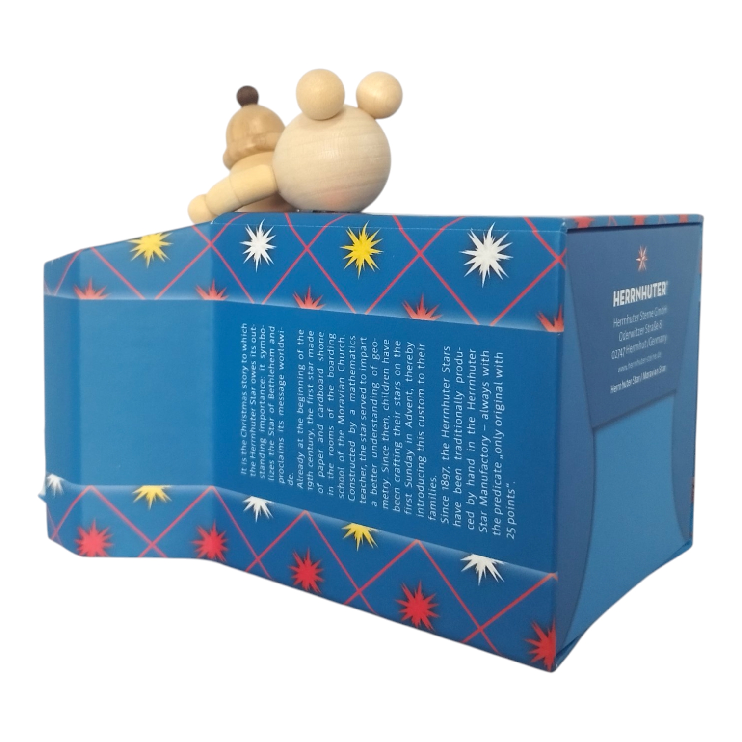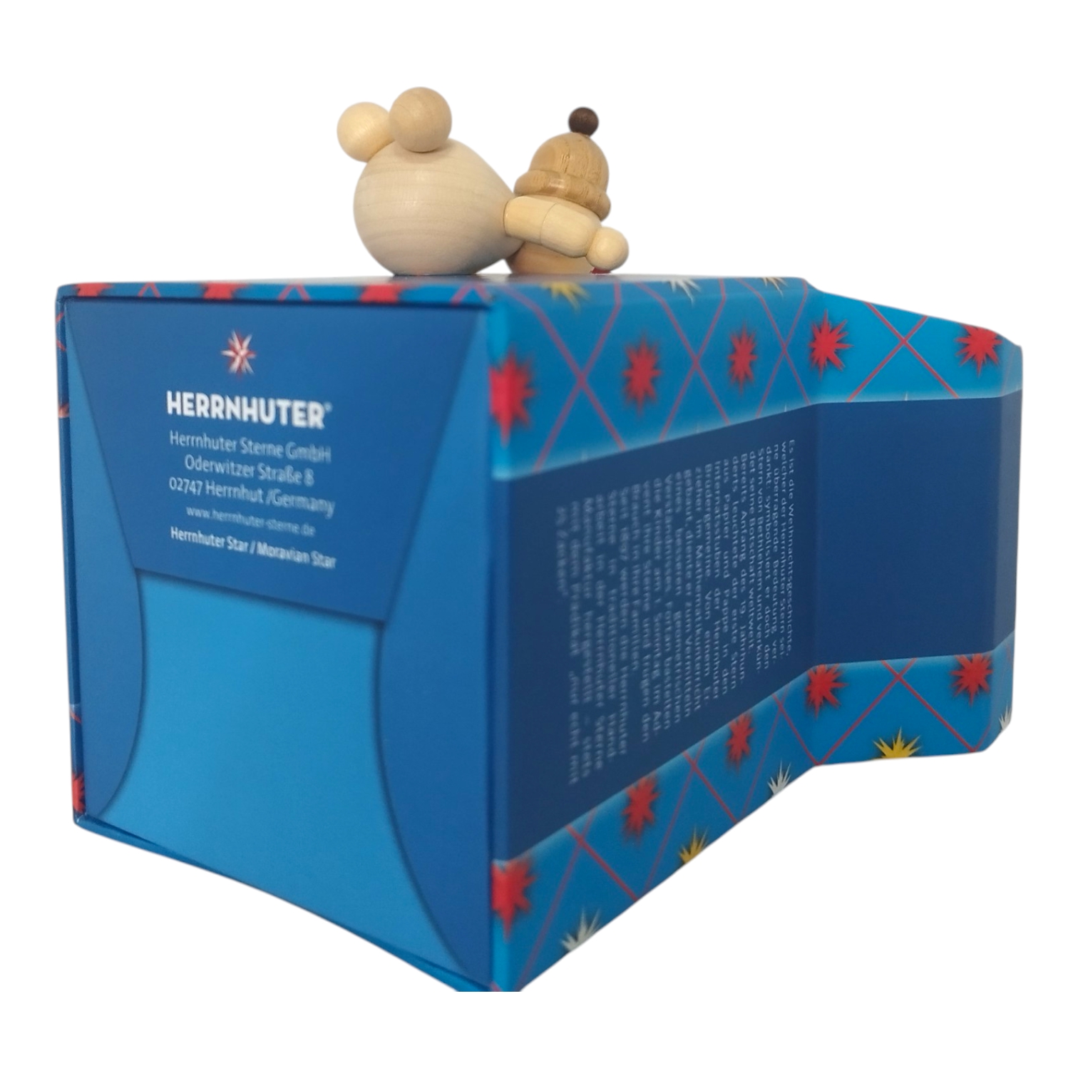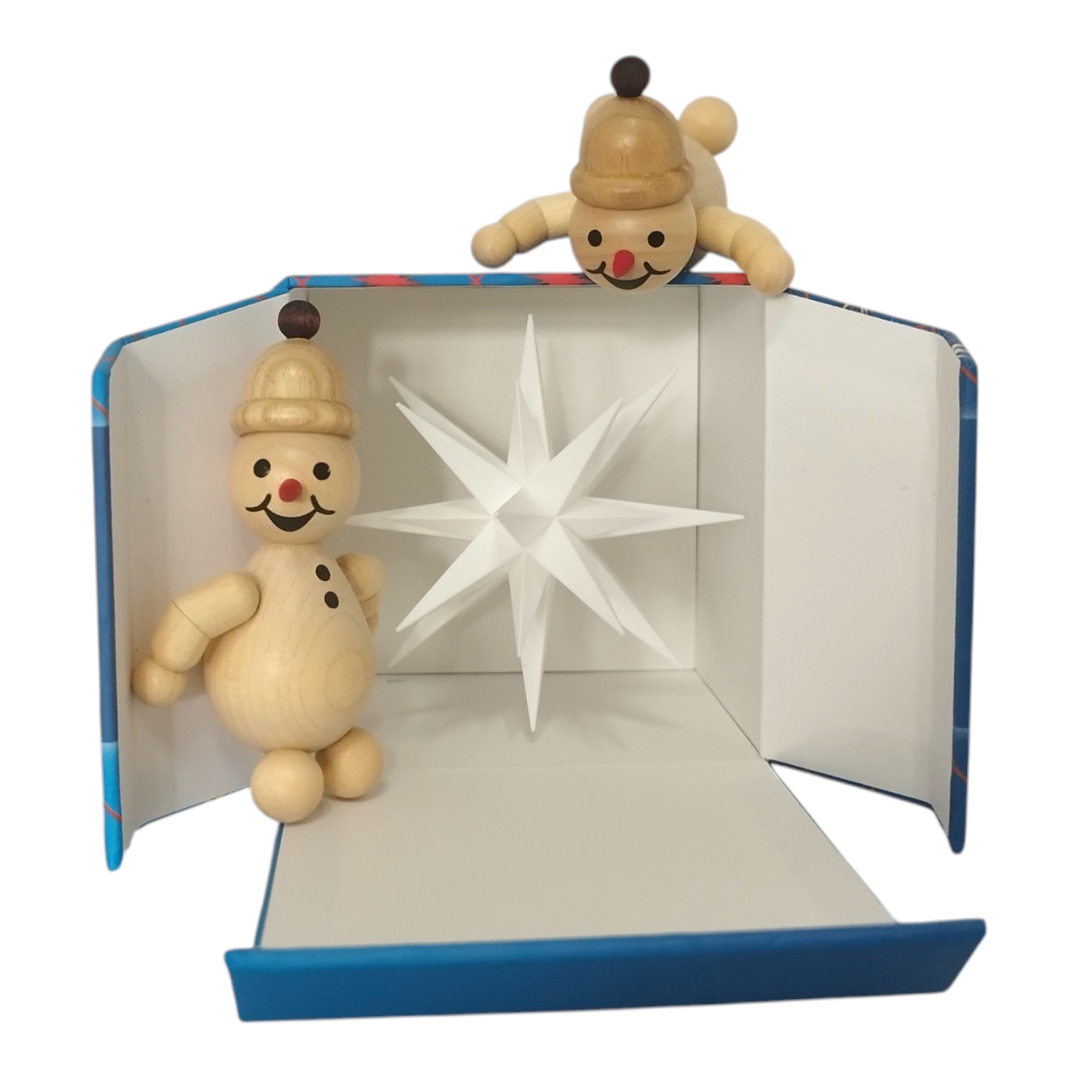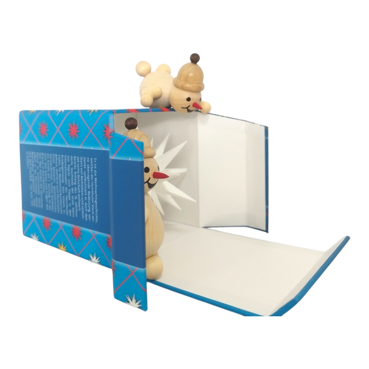 A charming scene unfolds as two snowmen from the Volkmar Wagner woodturning workshop curiously unwrap a Moravian star miniature star – a creation of three traditional Saxon companies. The typical packaging of the Herrnhut star takes center stage, deceptively realistic – crafted using an almost forgotten art: fine cardboard box making. Richter Kartonagen GmbH from Chemnitz is an expert in this field and a partner in this collaboration.