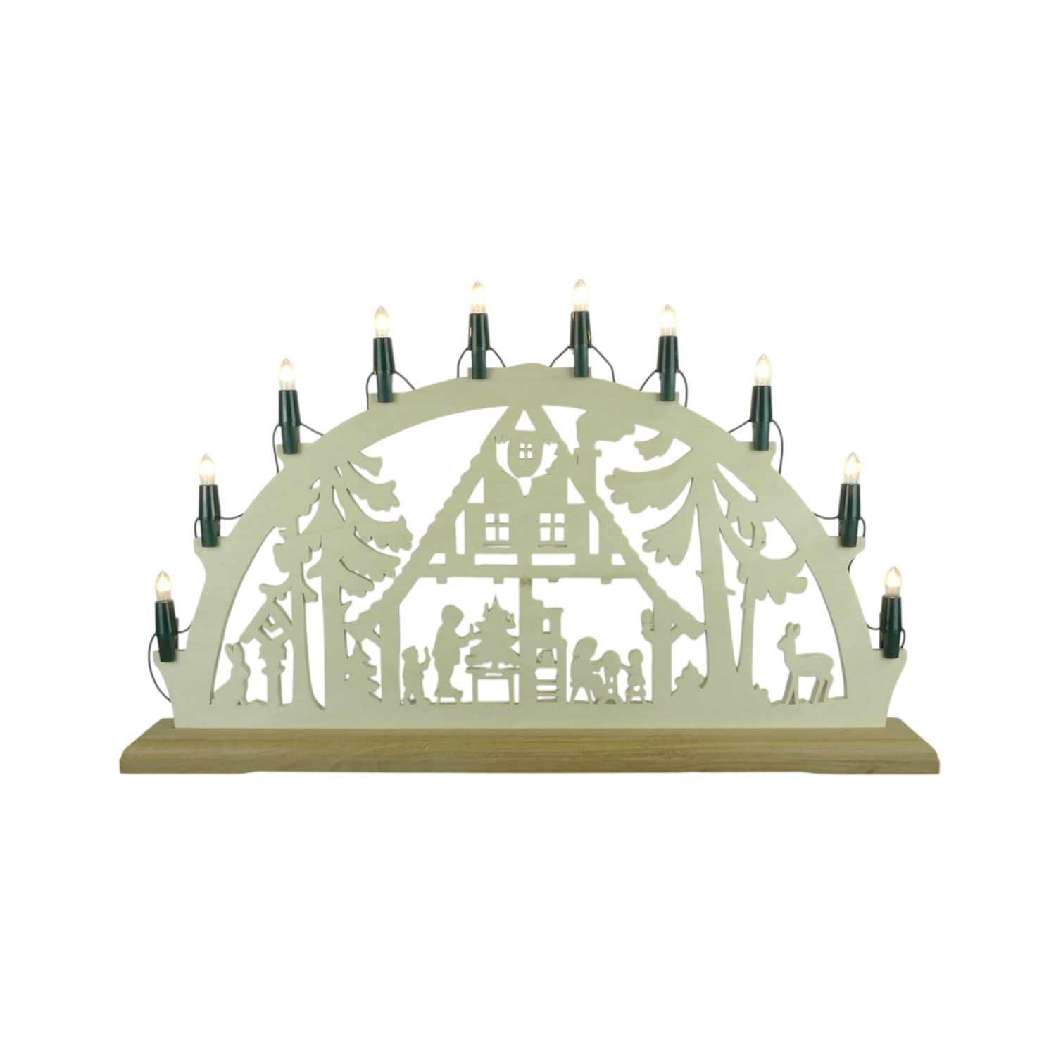 The simple and slim shape of the Narva candle arch chain with 10 Pointed candles, white is kept in a simple white that fits seamlessly into any Christmas decoration. Each candle has an E10 base in fir green and an output of 3 watts. The ribbed candle (tapered candle) lamps provide a warm and pleasant light, creating a festive atmosphere. A spare bulb is included so that a replacement can be provided immediately in case of failure.