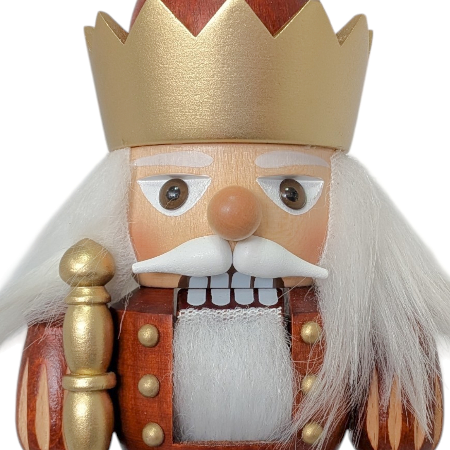His face is expressive and resolute. His alert eyes gaze attentively straight ahead, and his white mustache and full white beard lend him the air of a wise ruler. His mouth is classically open, his teeth visible – a true nutcracker, appearing focused and dignified.