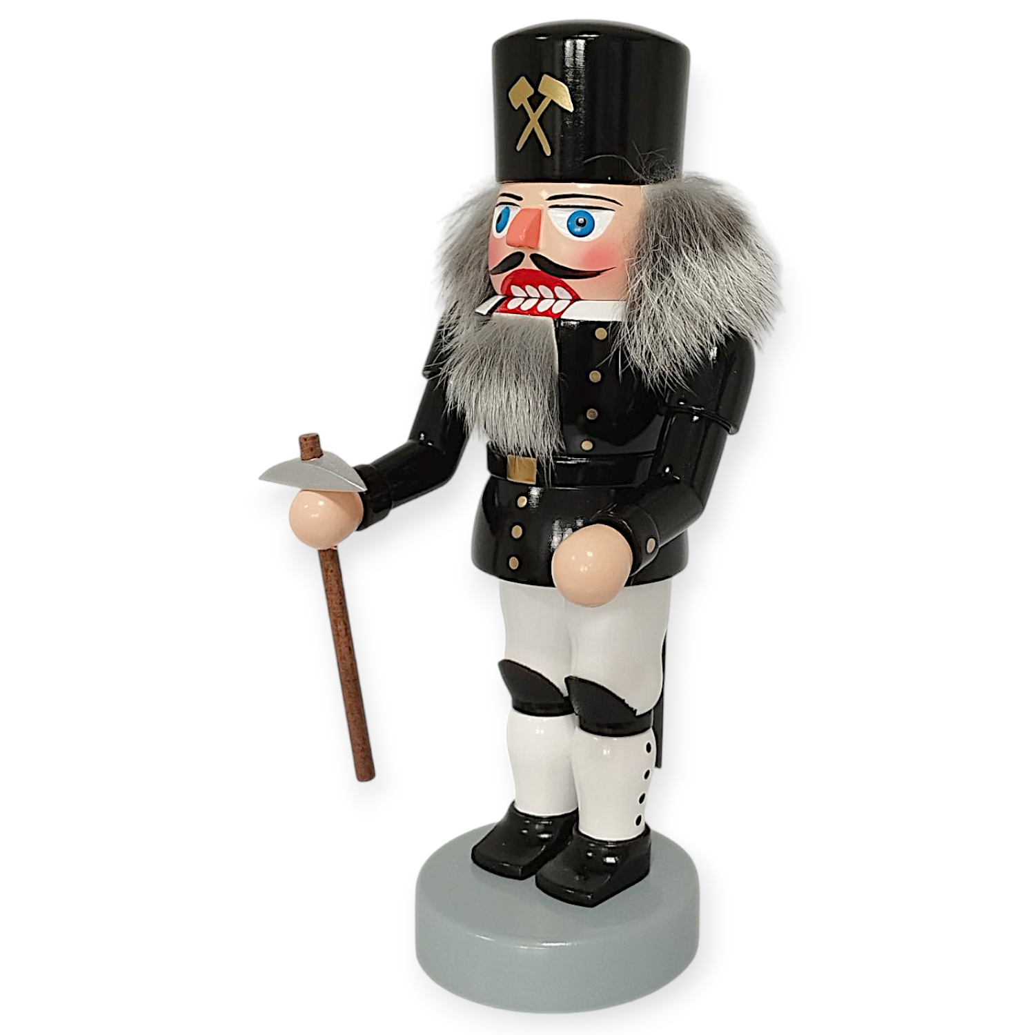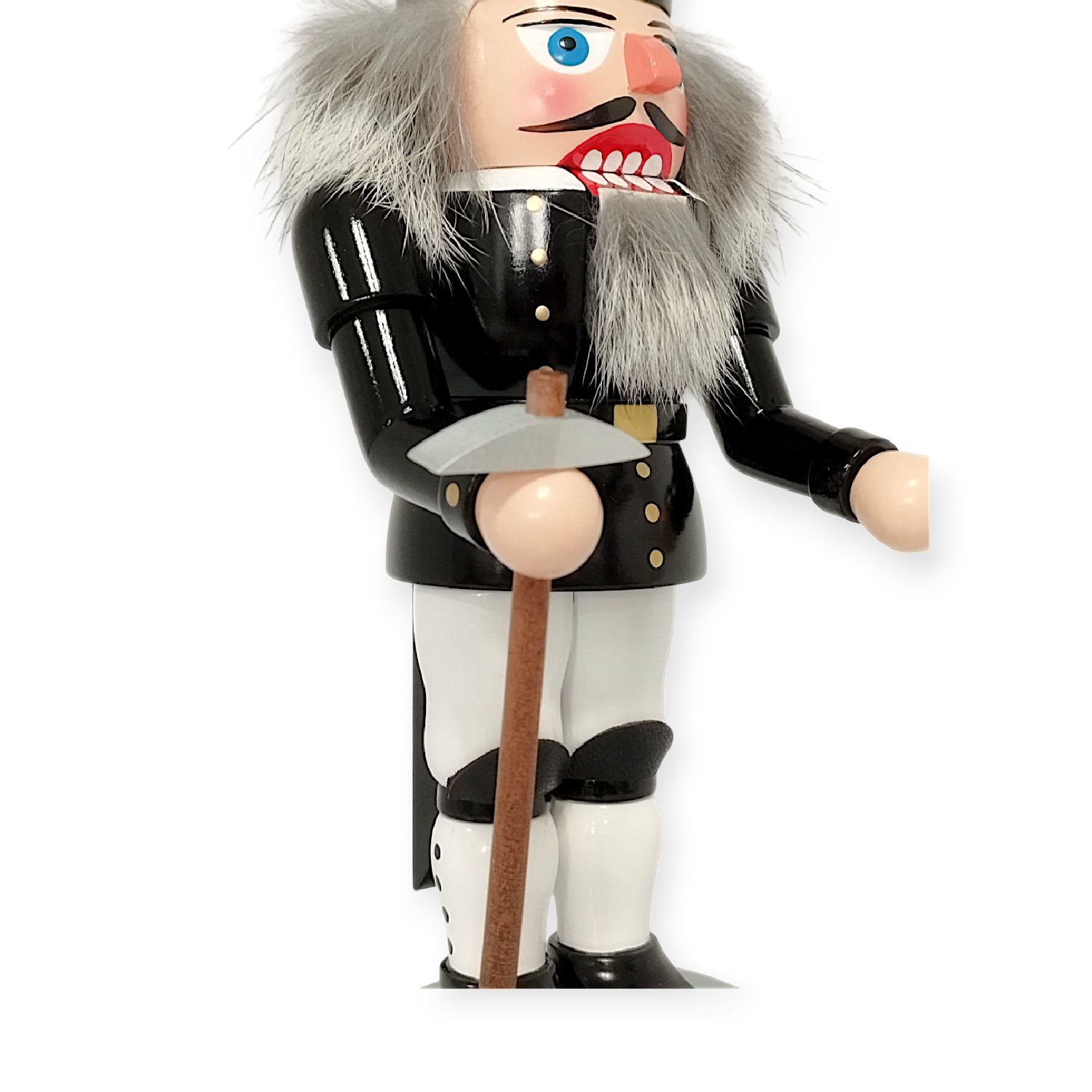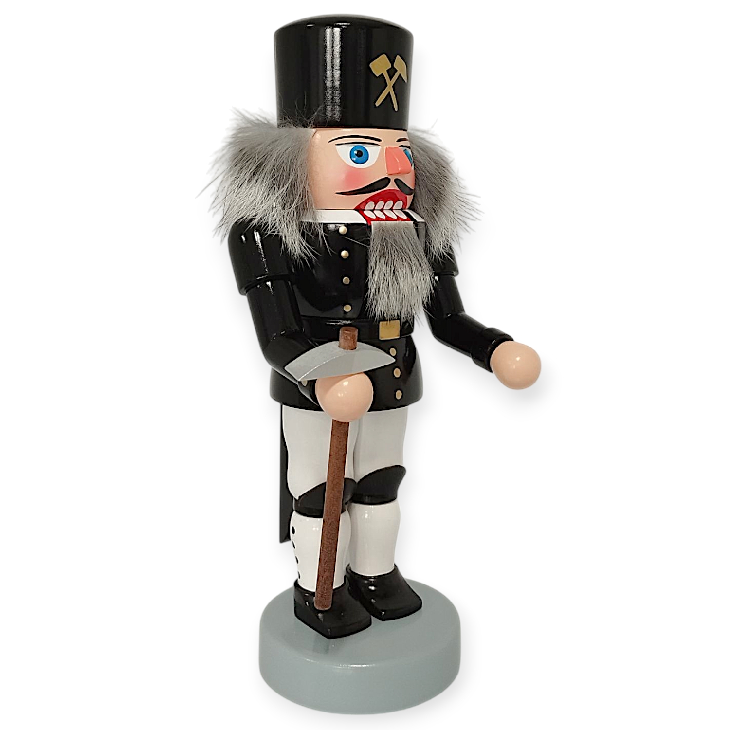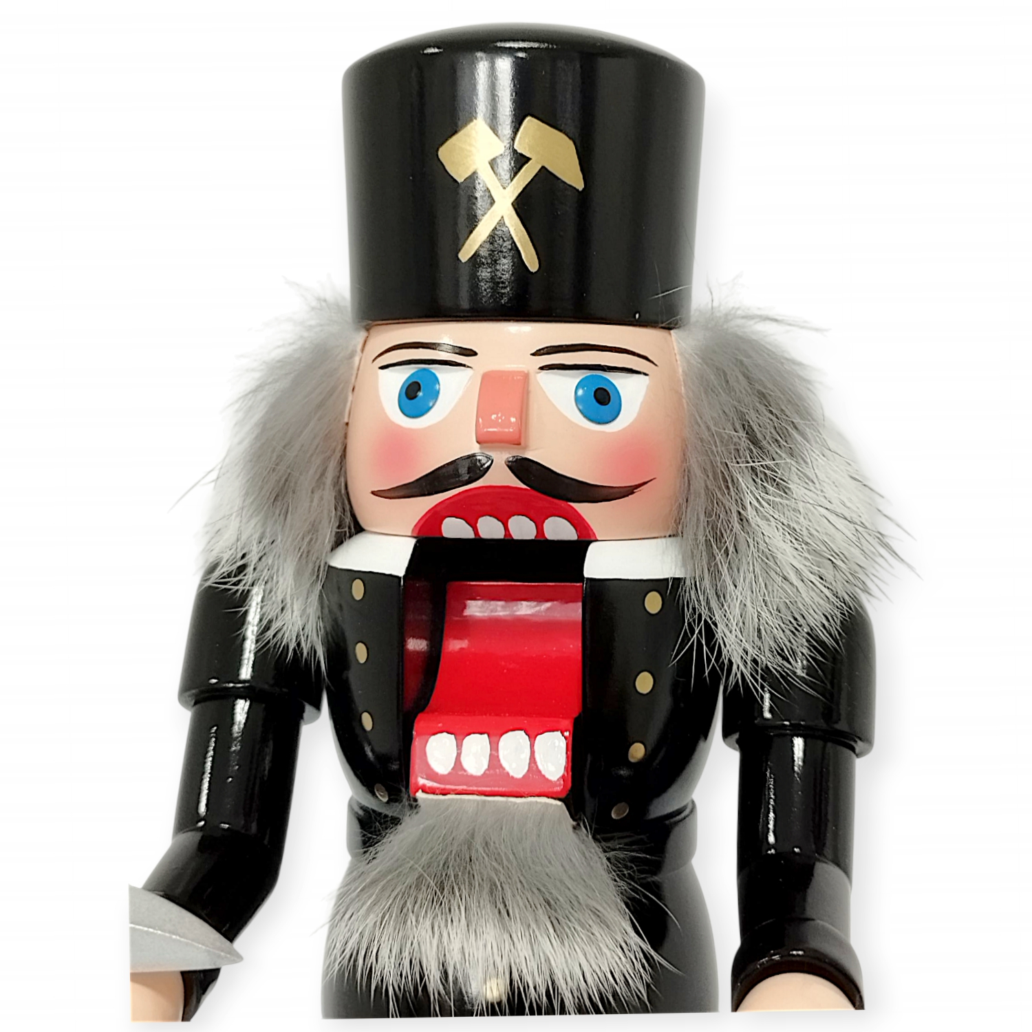 The miner wears an elegant black jacket with gold-colored buttons and a typical black cap decorated with the crossed miner’s tools of hammer and pick. White trousers and black boots complete his classic appearance. Particularly striking are his thick, gray beard and the fluffy, gray hair peeking out from under his hat, giving the nutcracker a noble yet robust appearance. His face is painted in a friendly and detailed manner, with bright blue eyes and a characteristic mustache.