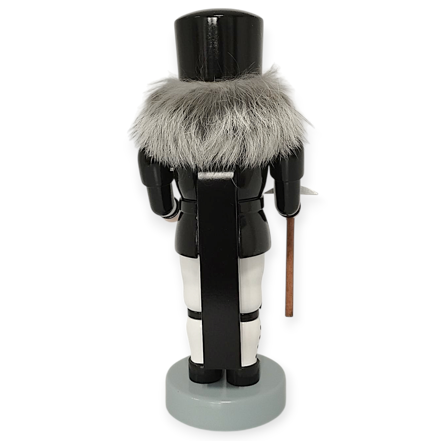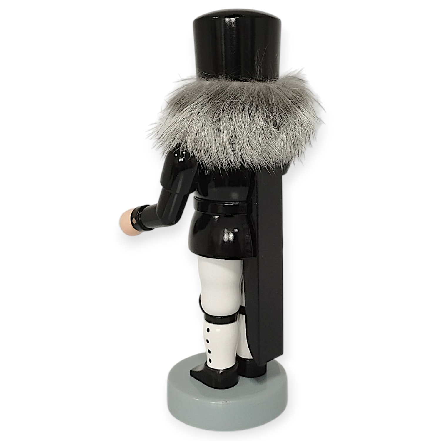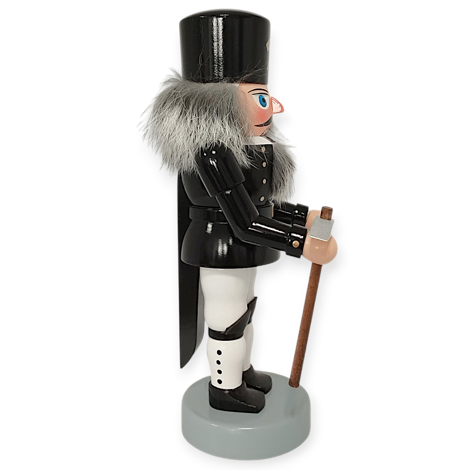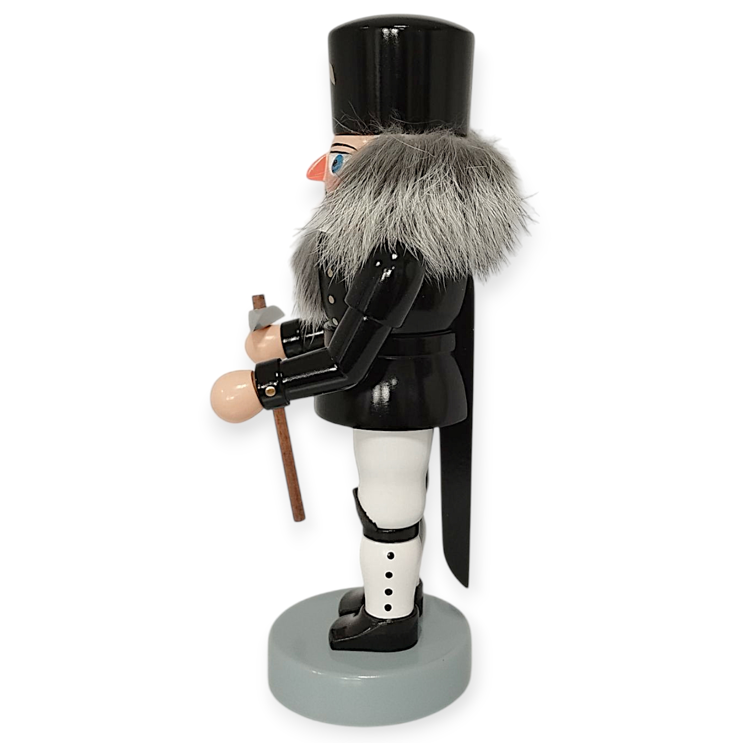 The miner wears an elegant black jacket with gold-colored buttons and a typical black cap decorated with the crossed miner’s tools of hammer and pick. White trousers and black boots complete his classic appearance. Particularly striking are his thick, gray beard and the fluffy, gray hair peeking out from under his hat, giving the nutcracker a noble yet robust appearance. His face is painted in a friendly and detailed manner, with bright blue eyes and a characteristic mustache.