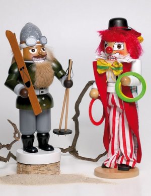 The miner has an angular face with blue eyes and striking gray eyebrows. His moustache is dark gray and gives him a serious expression. The Nutcracker’s typical red lips are open and his teeth are visible, which particularly emphasizes the mechanical aspect of the figure. His hair, which protrudes from the sides, is gray-white and matches the beard that adorns the moving part of the mouth.