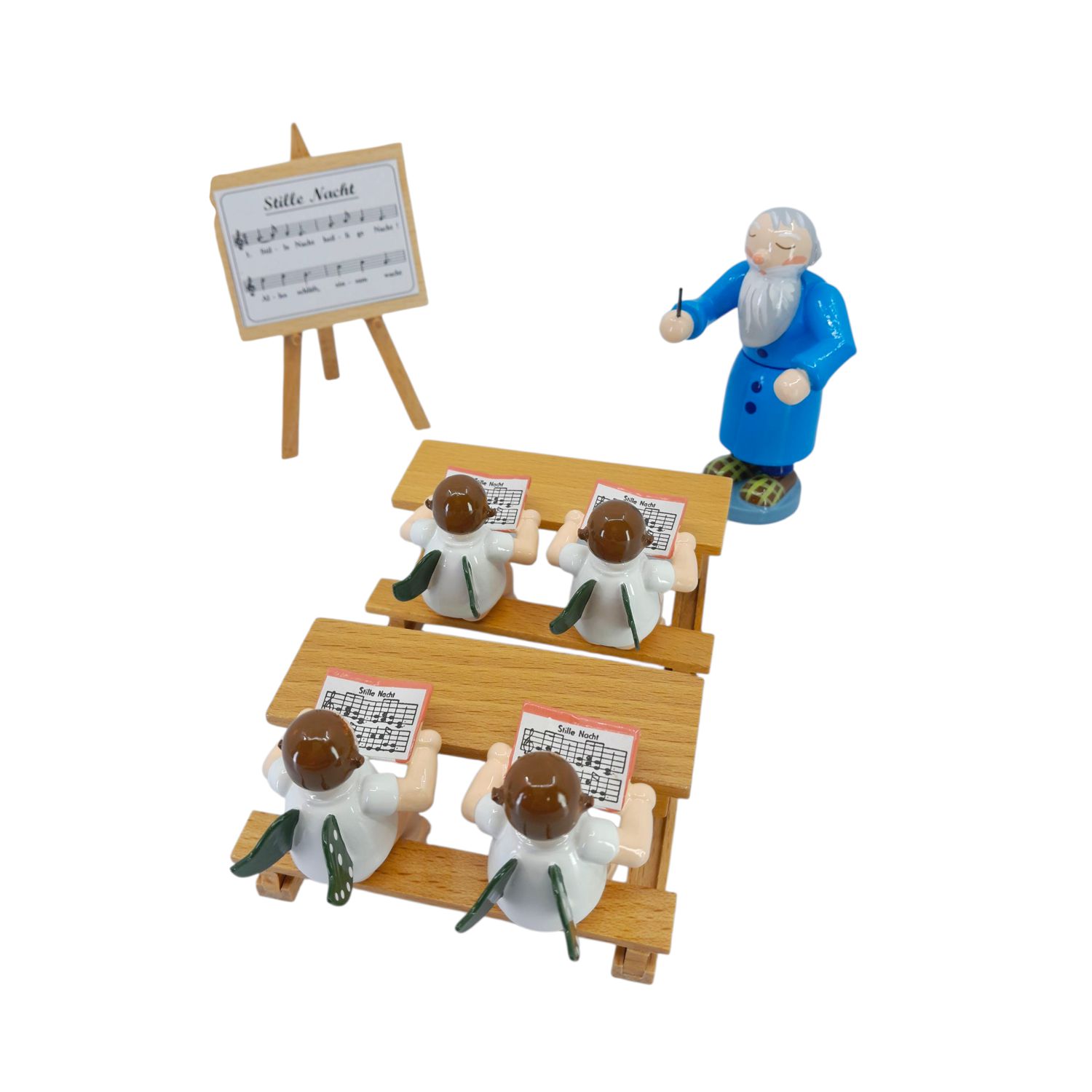 Peter and Angel School without a crown – 2 benches is a lovingly crafted miniature scene made of wood. It depicts an angel school where Peter stands before a small group of angels. The teacher wears a long, light blue coat and dark shoes. In his hand, he holds a baton, with which he sets the tempo. In front of him is a small wooden tablet on an easel stand. On the tablet is a sheet of music with the title “Silent Night.” Below are printed musical notes and lyrics, indicating that this is a music lesson.