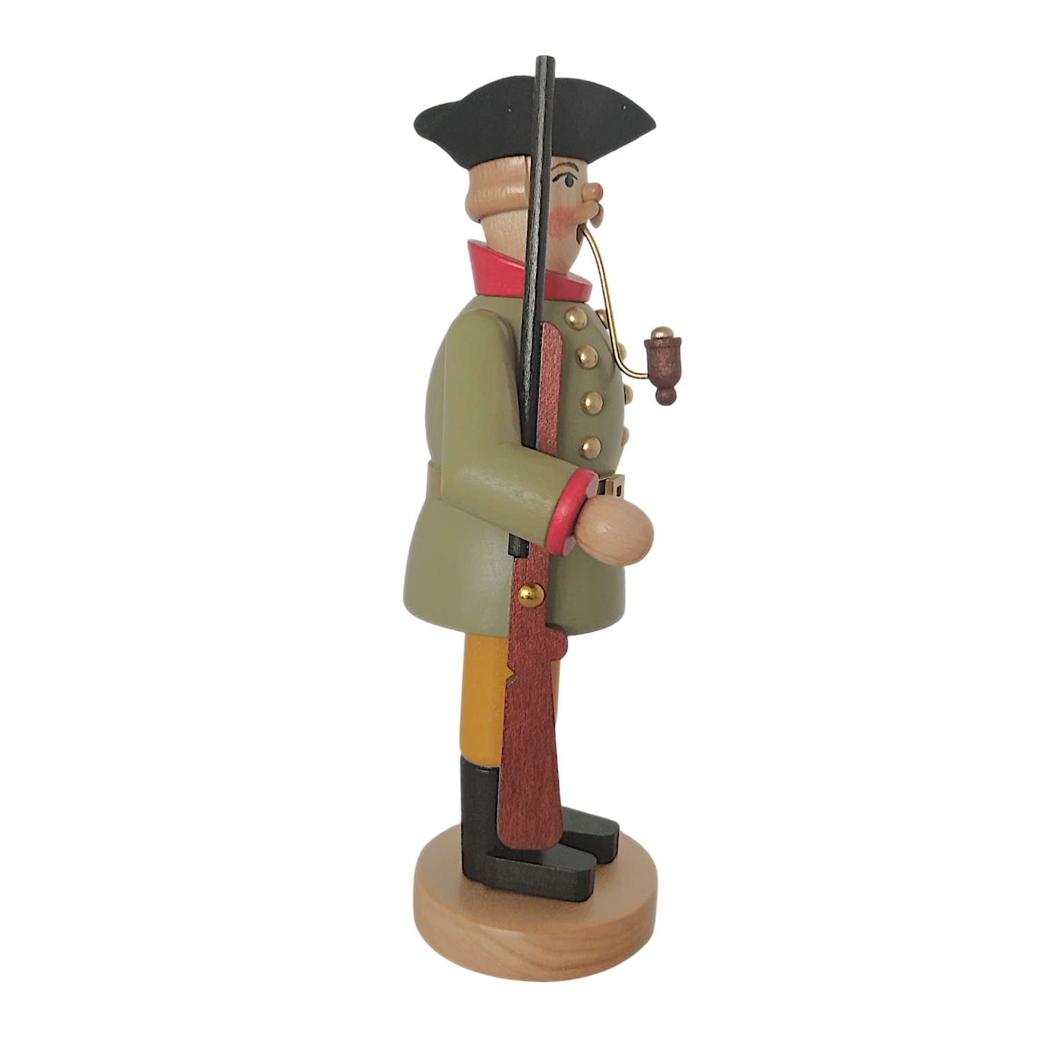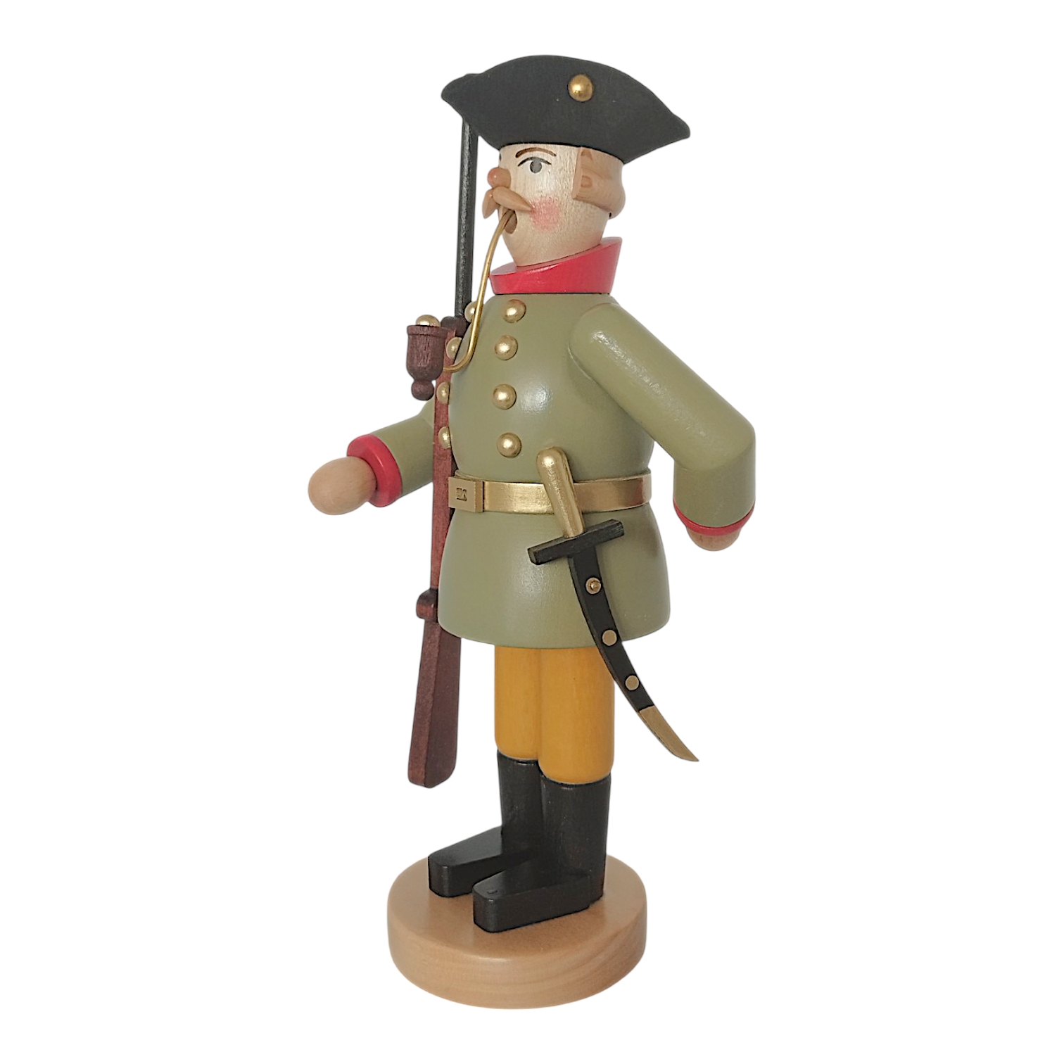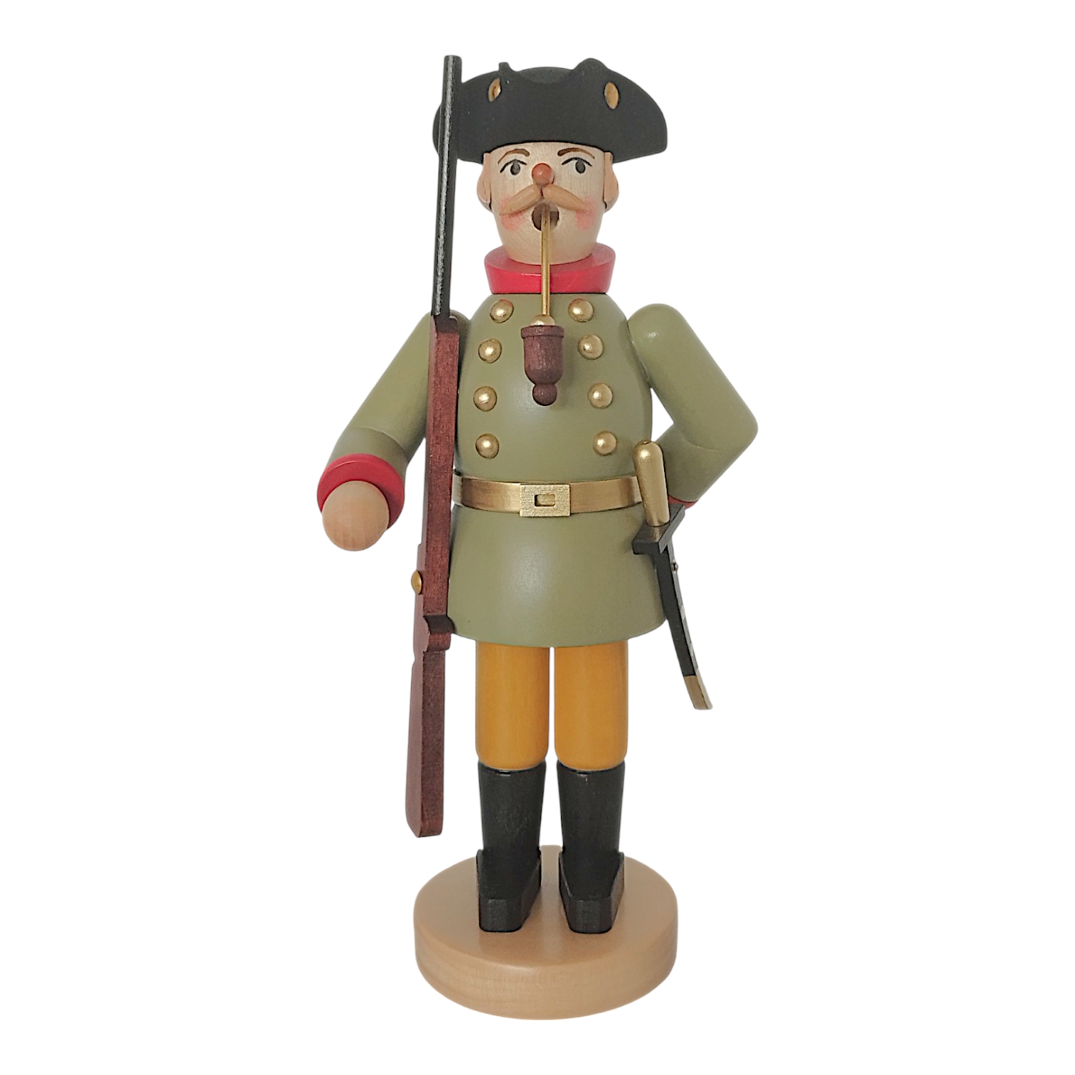 The Jäger has a friendly face with alert eyes, rosy cheeks, and a handsome mustache. A special feature of this figurine is the long pipe firmly inserted in his wide-open mouth, from which the pleasant aroma of incense wafts. Filling the figurine is incredibly easy, as the torso can be easily detached from the legs to insert an incense cone.