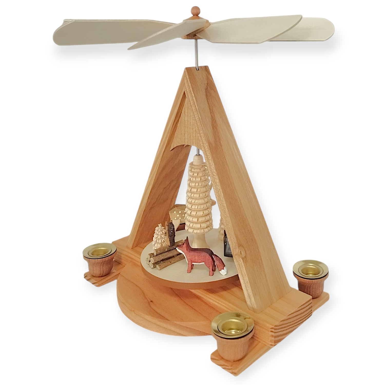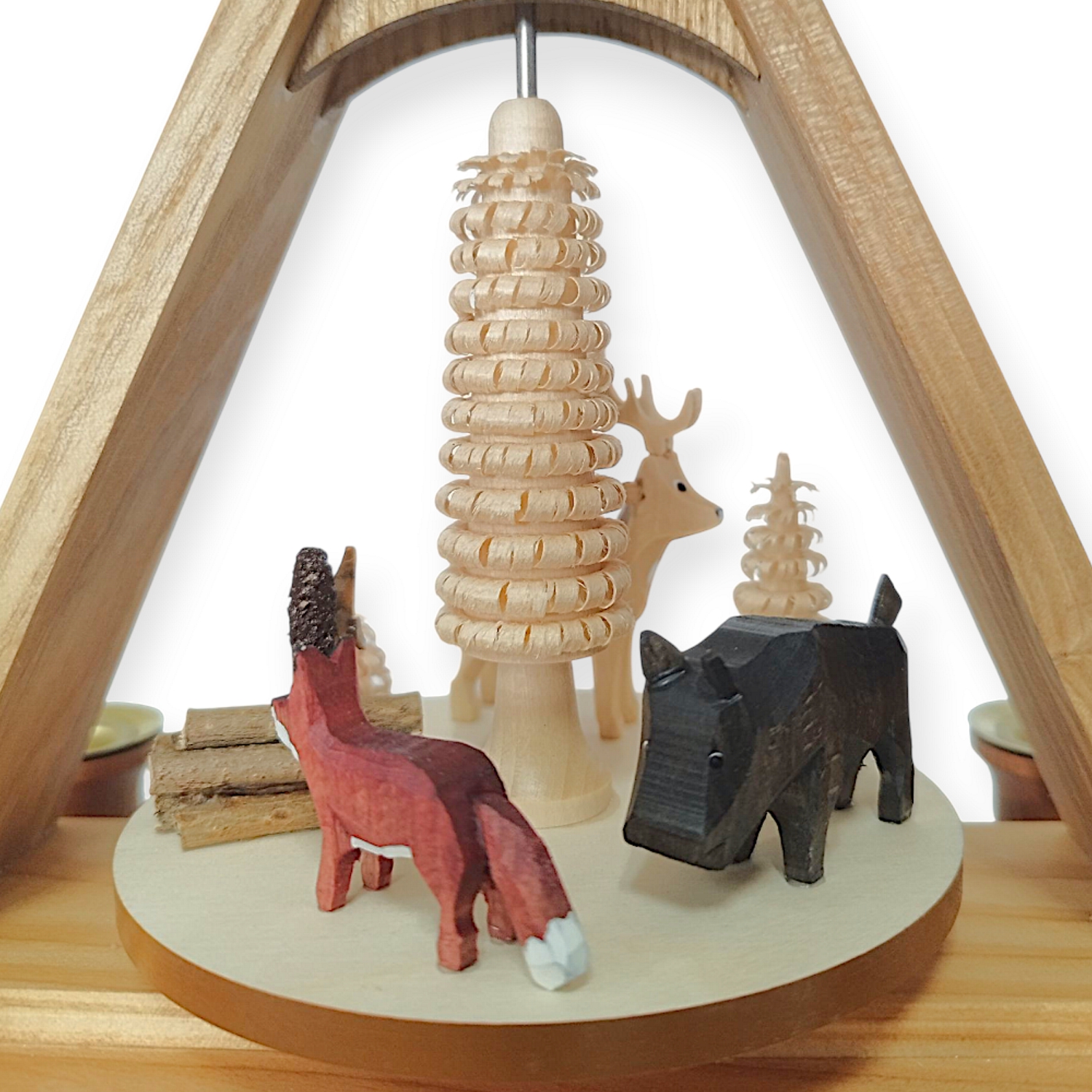 The pyramid has a stable base and accommodates four wax candles, whose light drives the impeller. As the animals slowly rotate in the rising heat, a fascinating play of shadows is created. The gentle rotation connects all the wild animals and evokes memories of walks in nature. The balanced placement of the figures creates a harmonious overall picture that delights both adults and children.