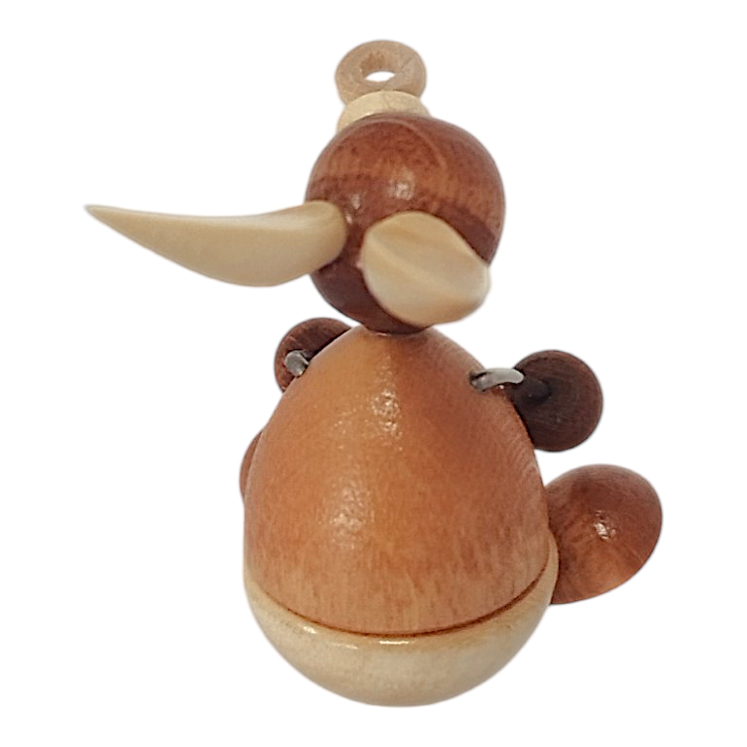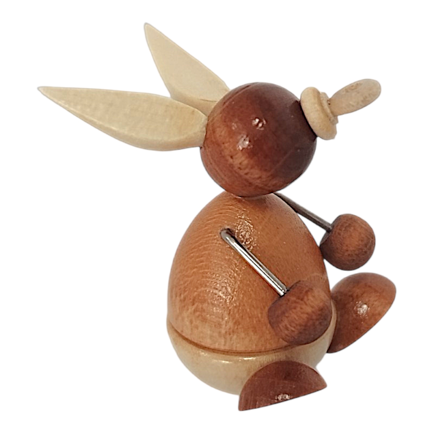 The baby’s ears are also made of light wood and, due to their size relative to its small head, appear especially endearing. Its arms are short, dark wire elements with small wooden paws, which it holds out curiously. The figurine depicts the little one nestling trustingly against its father’s leg, sitting securely on his large foot, emphasizing the close bond and sense of security within the rabbit family.