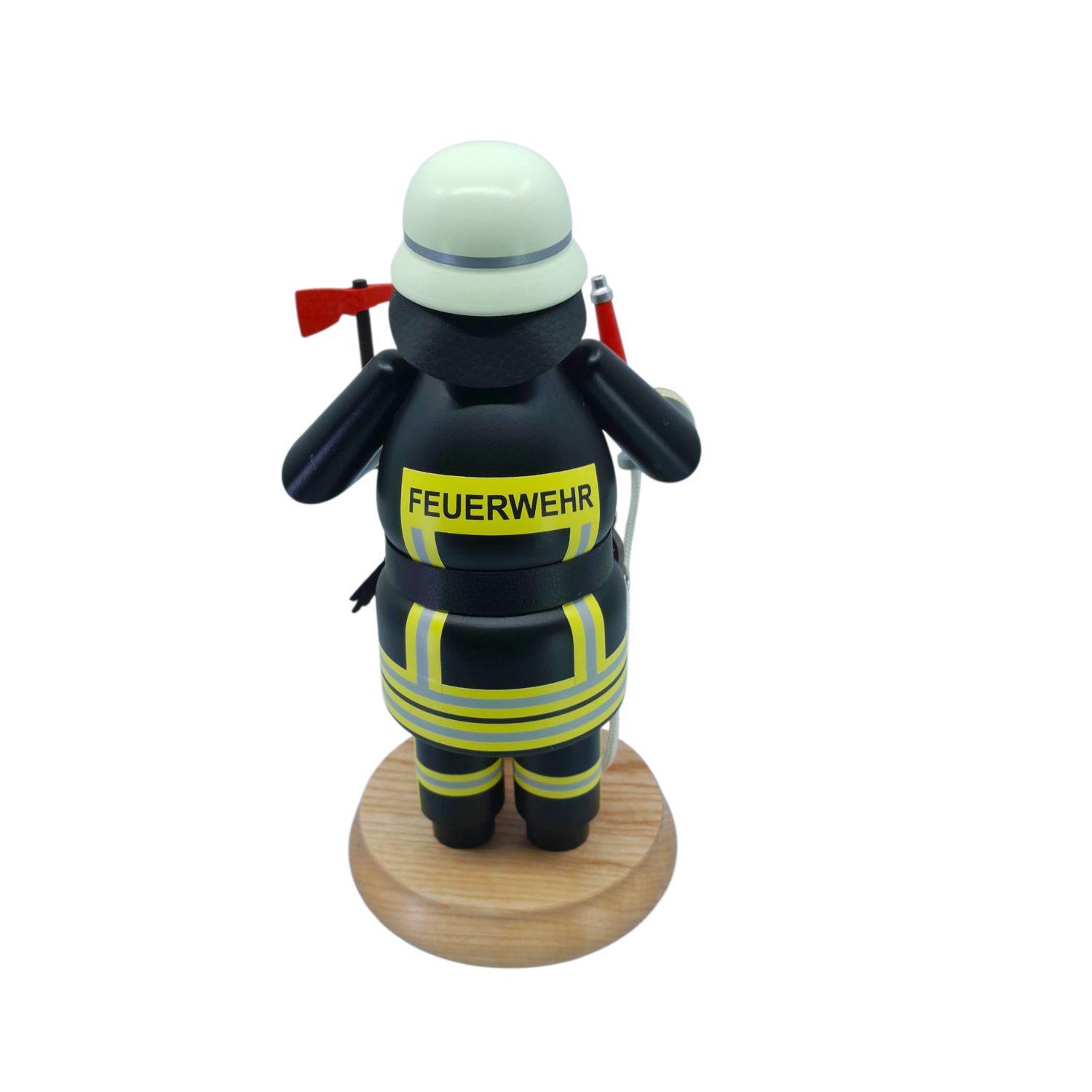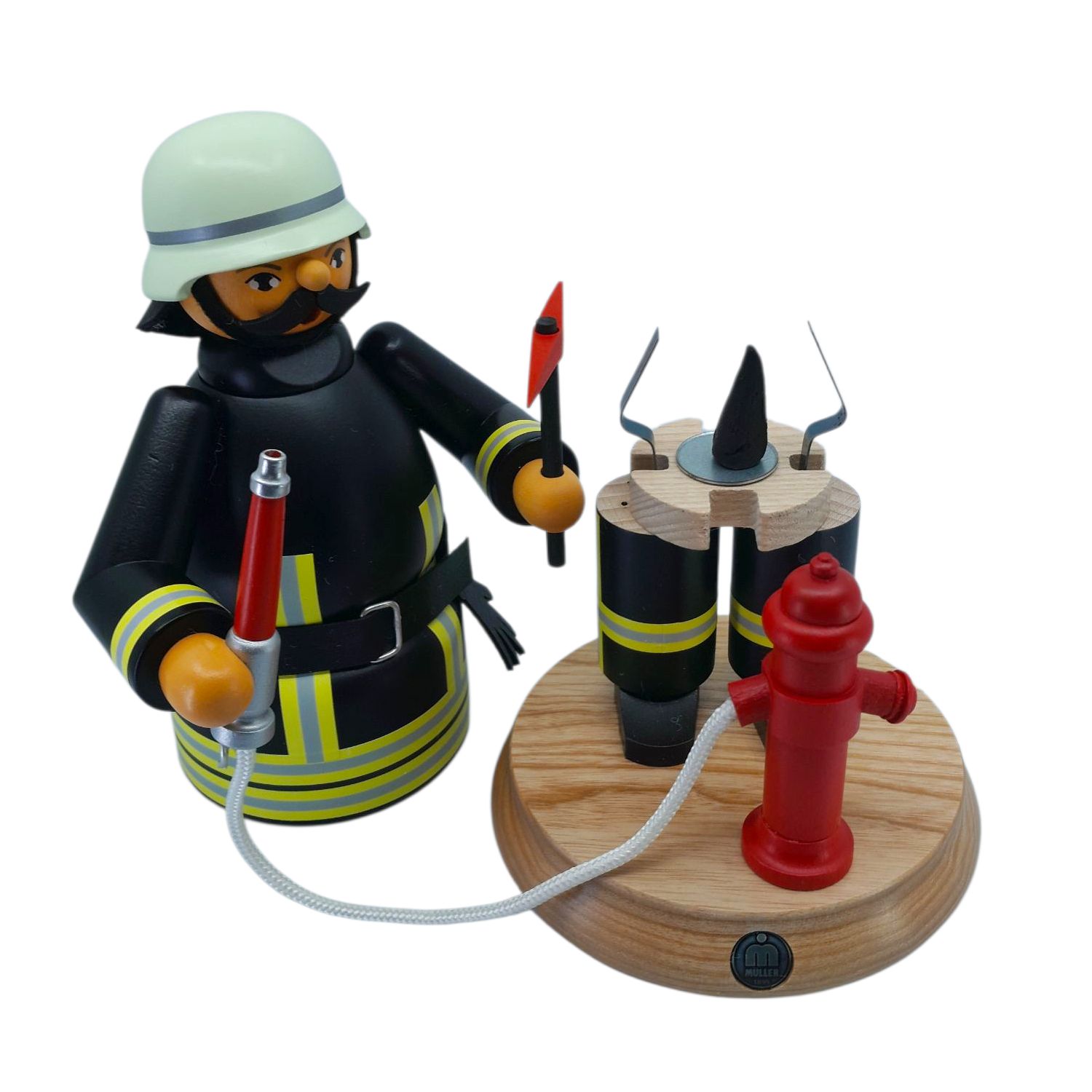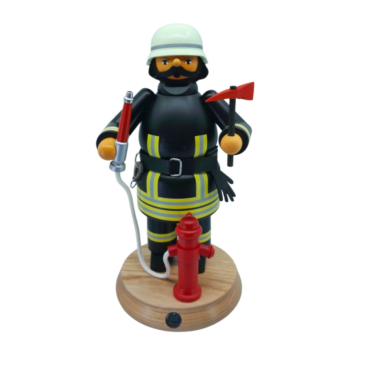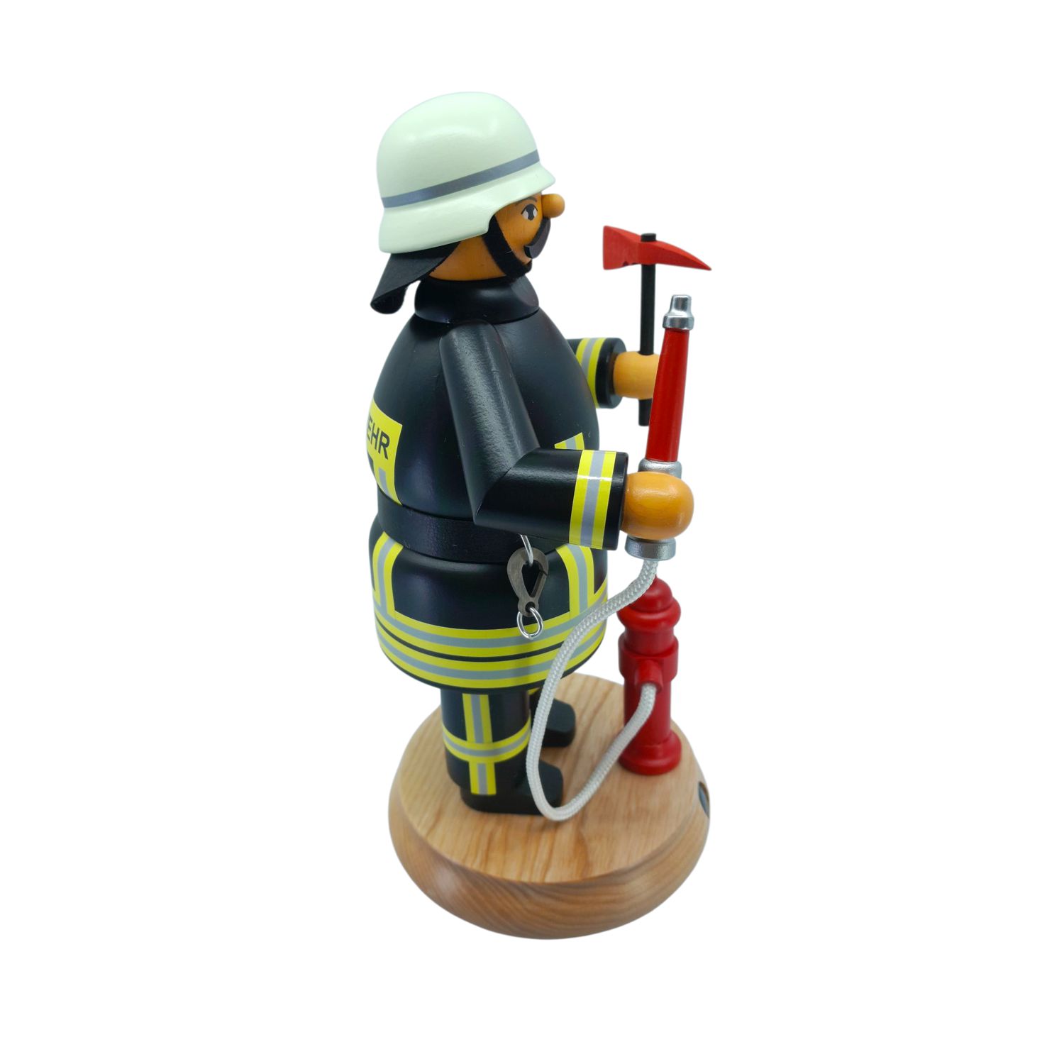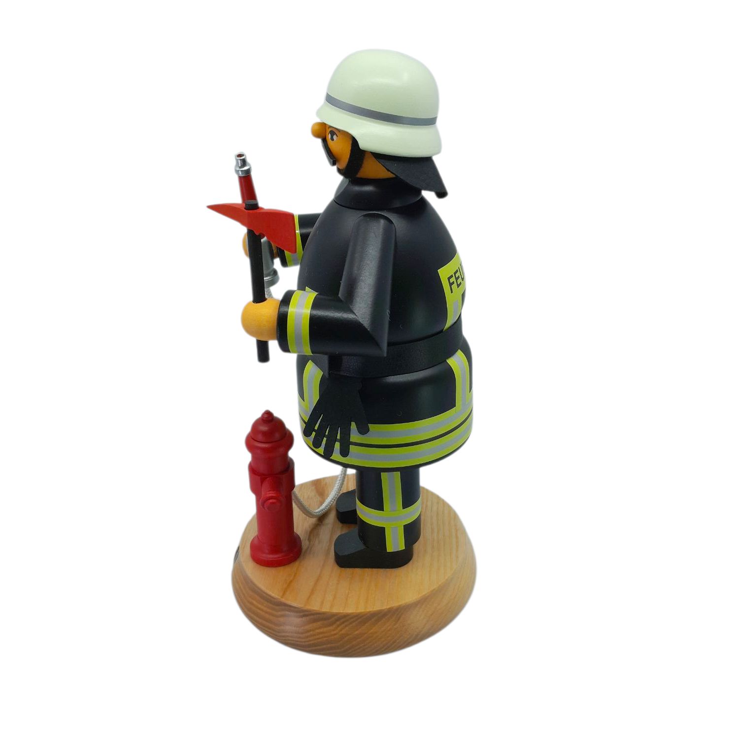 In his right hand, the fireman holds a small red axe, an indispensable tool in use that is both symbolic and practical for the work of a fireman. In his left hand he has a fire hose that ends with a silver nozzle. This hose is connected to a red hydrant mounted on the figure’s round, light wooden base. The hydrant and hose underline the readiness for action and the typical equipment of a firefighter.