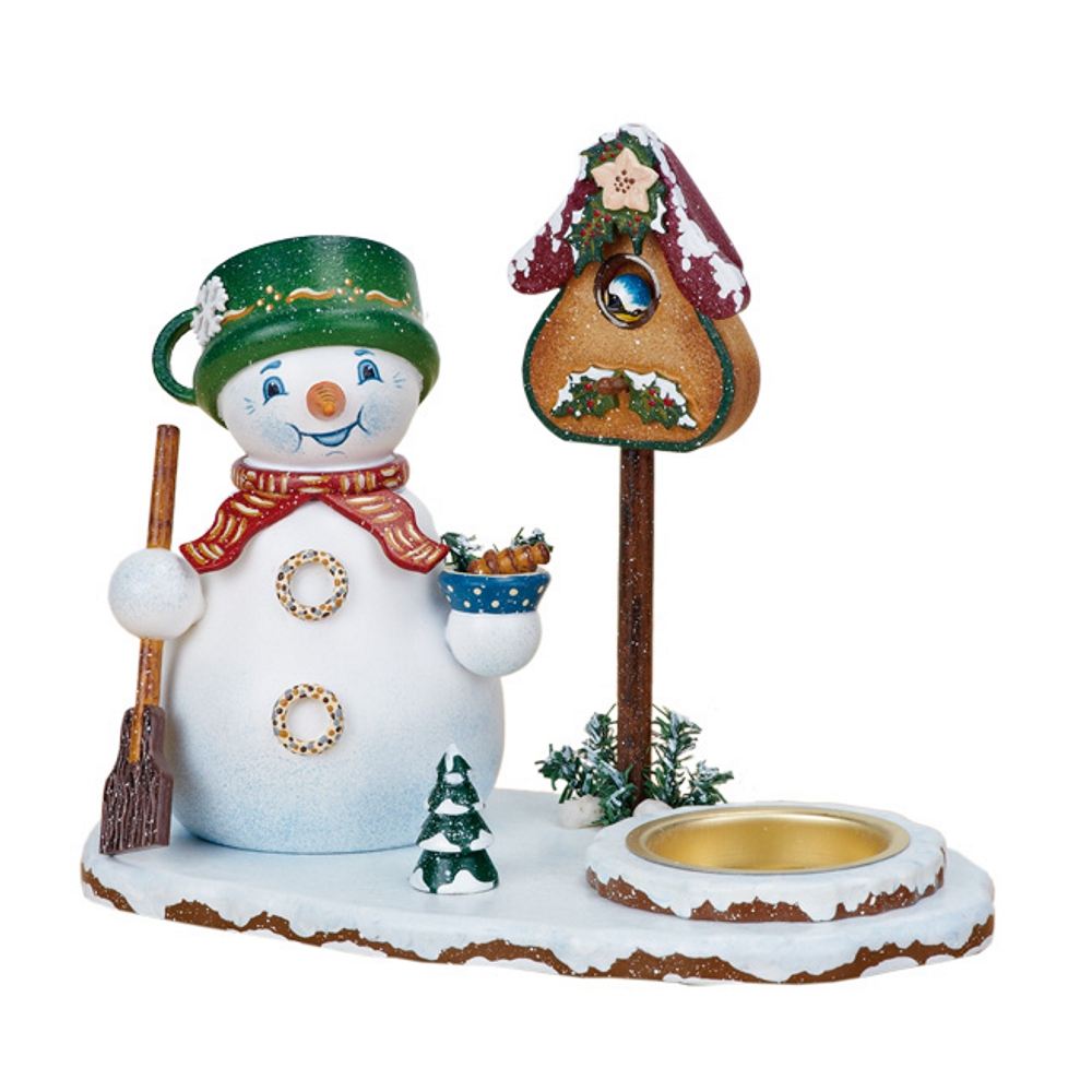 Lovingly and elaborately hand-painted smoker snowman with tealight, detailed and wintry, he accompanies us through the cold season. With a spherical body and a pot on his head, the snowman with a snow shovel and a bowl of gingerbread in his hand is standing in the shiny white snow, next to him is a large birdhouse from which a small blue tit looks out. Next to the bird house there is a tealight holder which can be fitted with commercially available tealights.
