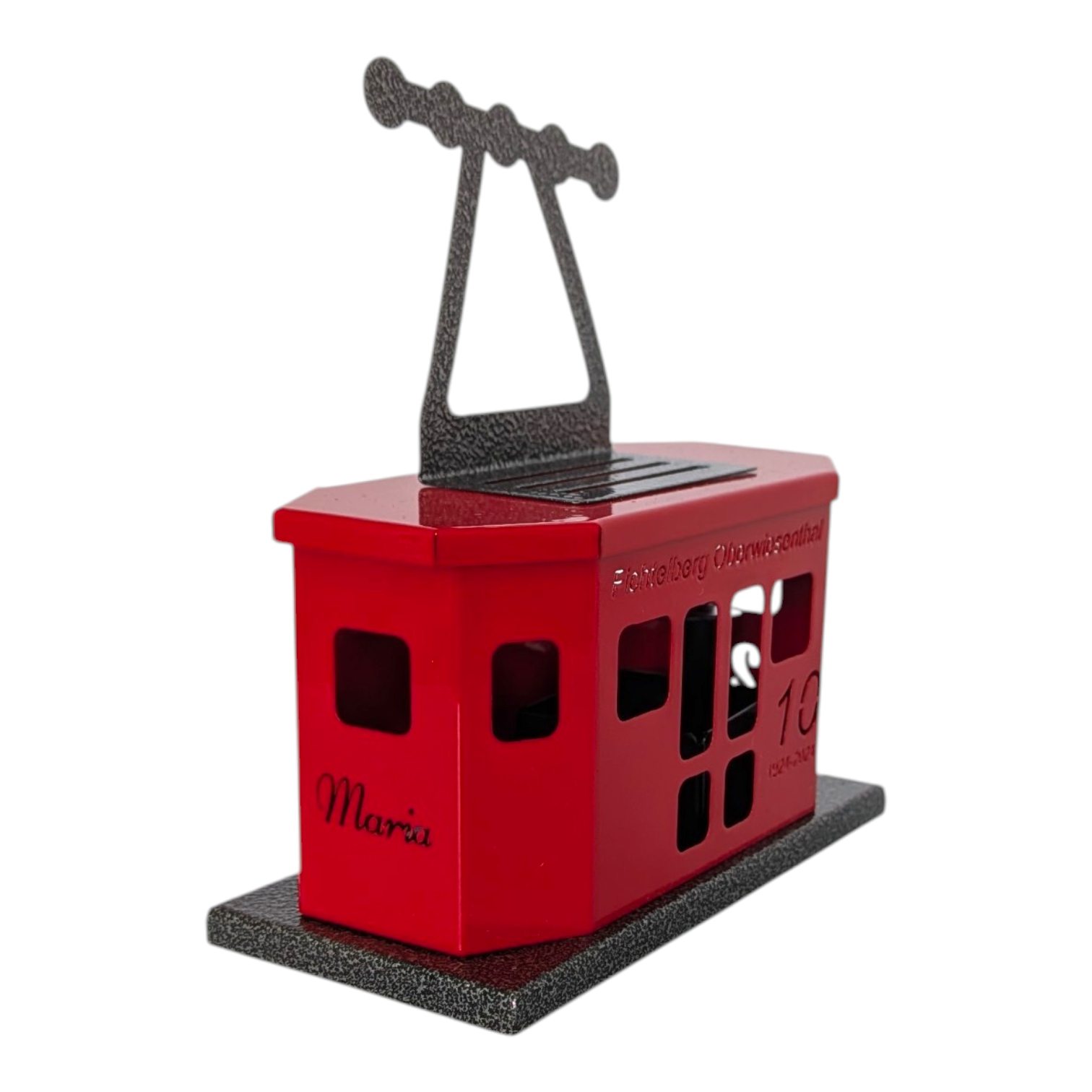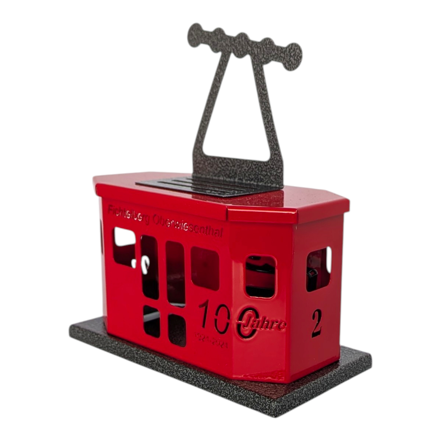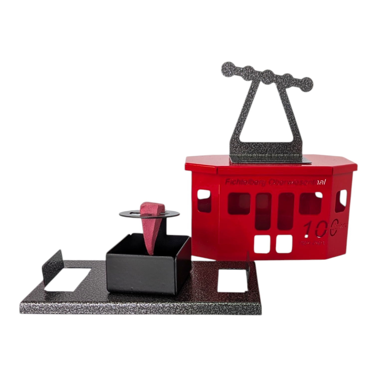 The Maria incense gondola, a true masterpiece of Erzgebirge craftsmanship, brings the nostalgic charm of the Fichtelberg cable car directly into your living room. This elegant model, crafted from robust, high-quality powder-coated metal, immediately catches the eye with its vibrant red color and precise replica of the legendary cabins. The designers created the Maria as an exclusive anniversary edition to celebrate the 100th anniversary of the Fichtelberg cable car (1924–2024). The delicate cut-out design of the number “100” on the front is particularly captivating, as it glows atmospherically when in use and gently diffuses the spicy fragrance throughout the room.