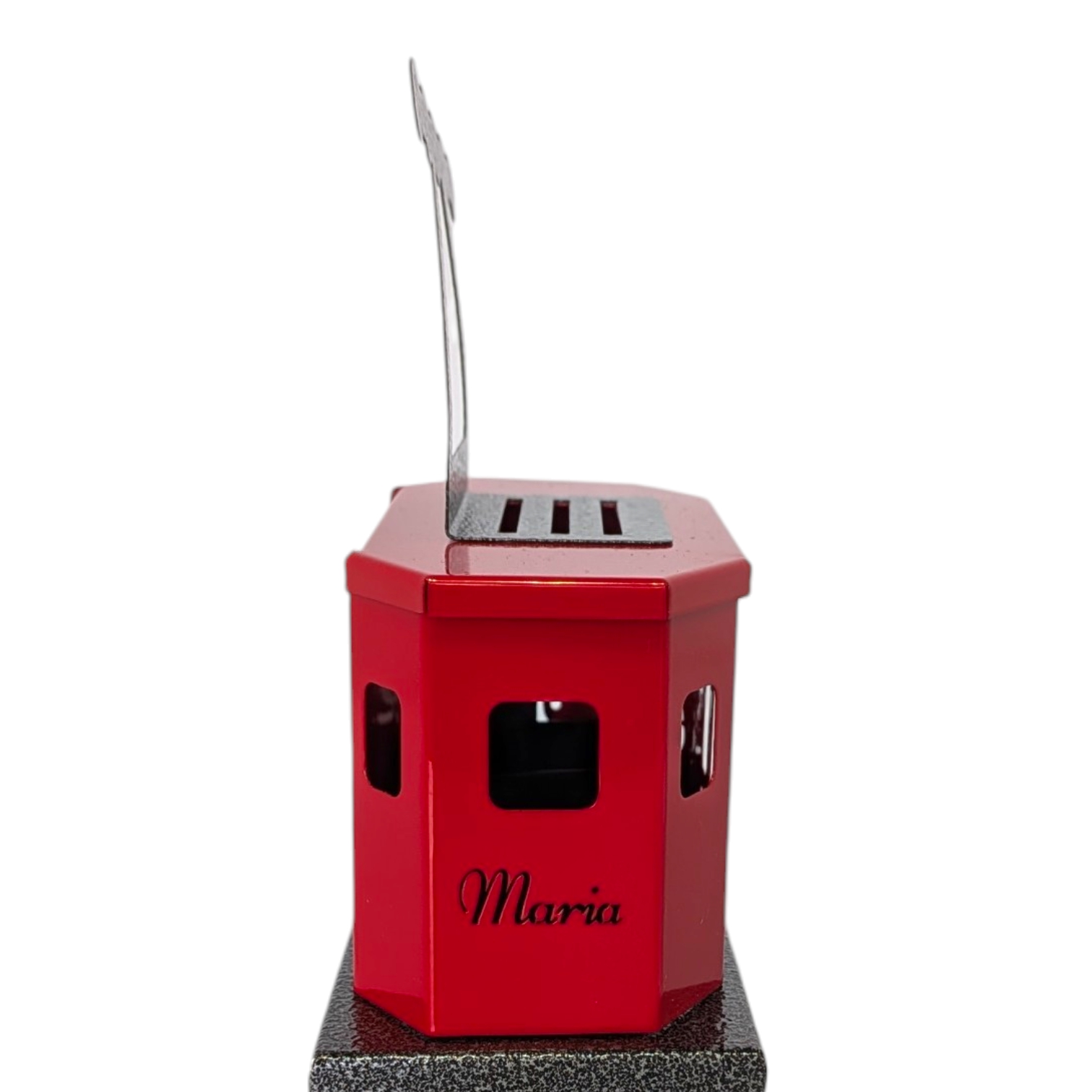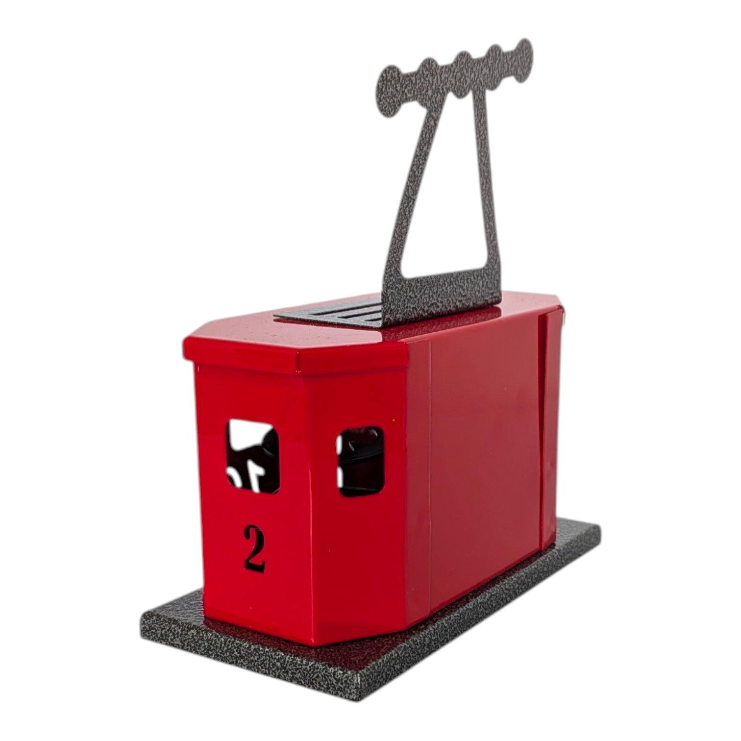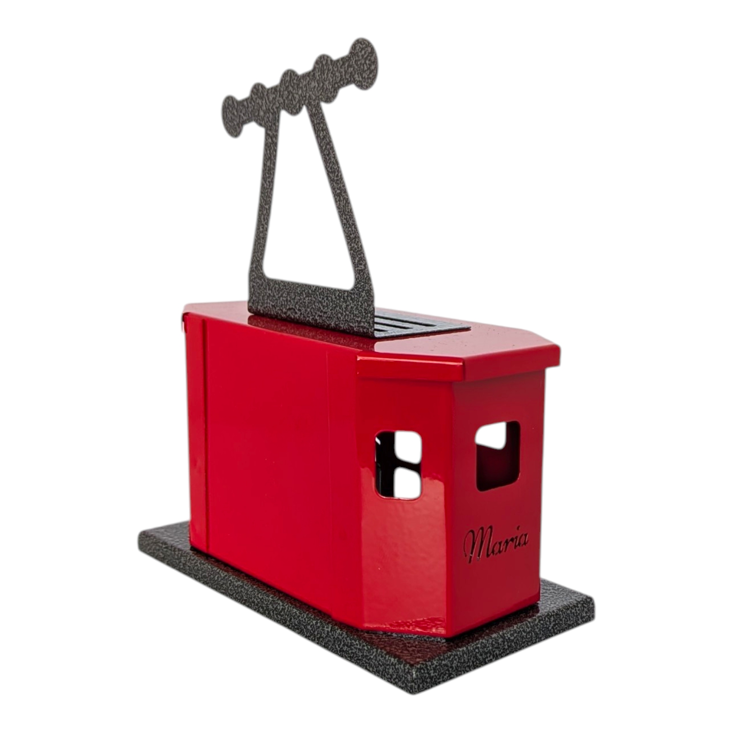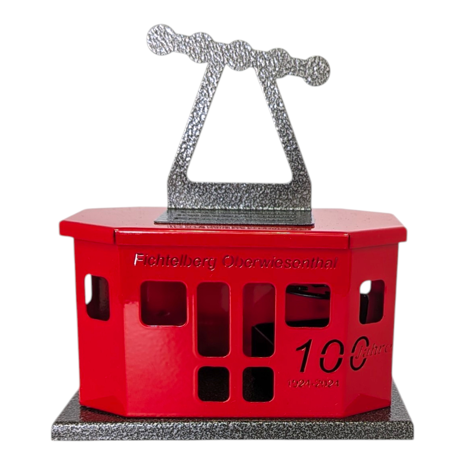 The Maria incense gondola, a true masterpiece of Erzgebirge craftsmanship, brings the nostalgic charm of the Fichtelberg cable car directly into your living room. This elegant model, crafted from robust, high-quality powder-coated metal, immediately catches the eye with its vibrant red color and precise replica of the legendary cabins. The designers created the Maria as an exclusive anniversary edition to celebrate the 100th anniversary of the Fichtelberg cable car (1924–2024). The delicate cut-out design of the number “100” on the front is particularly captivating, as it glows atmospherically when in use and gently diffuses the spicy fragrance throughout the room.