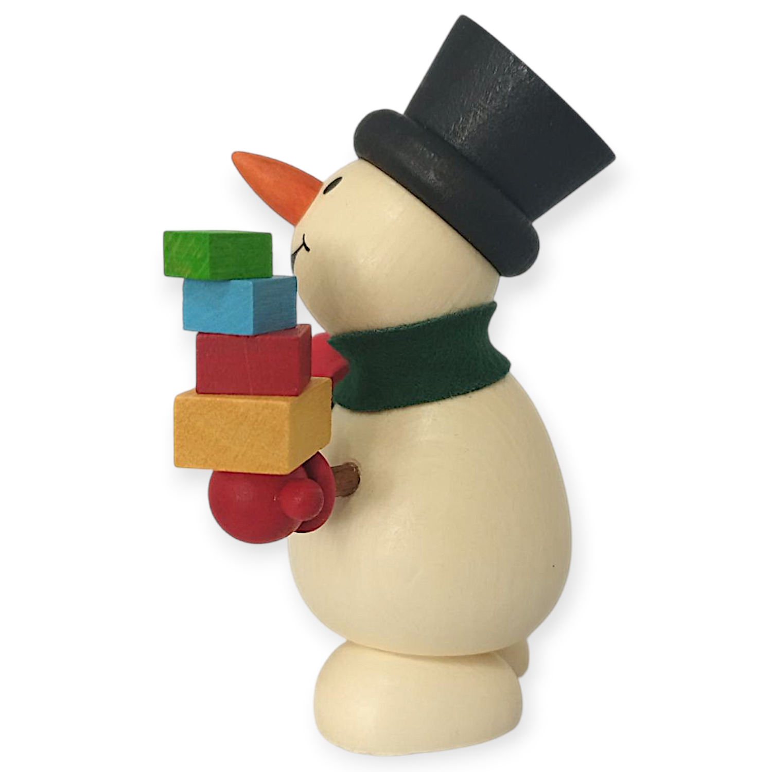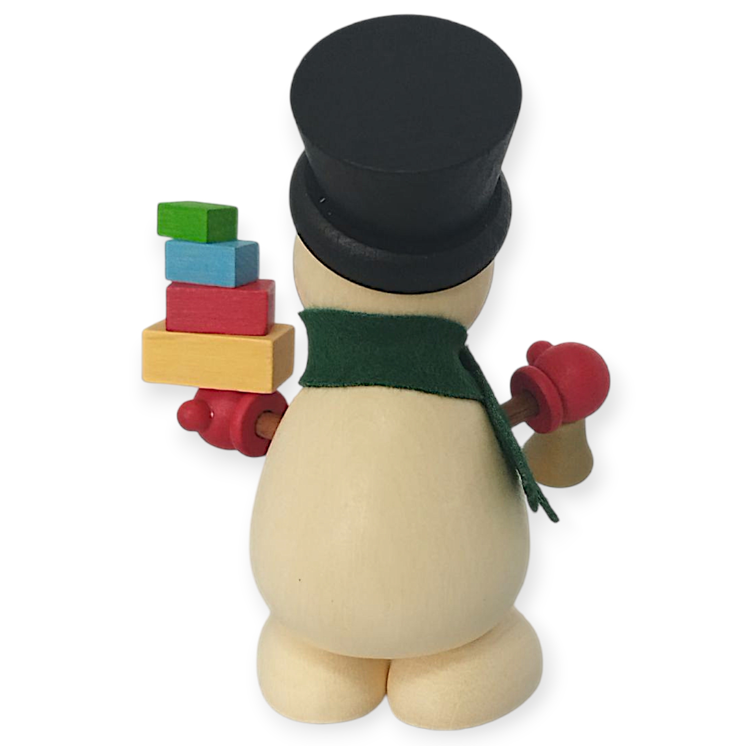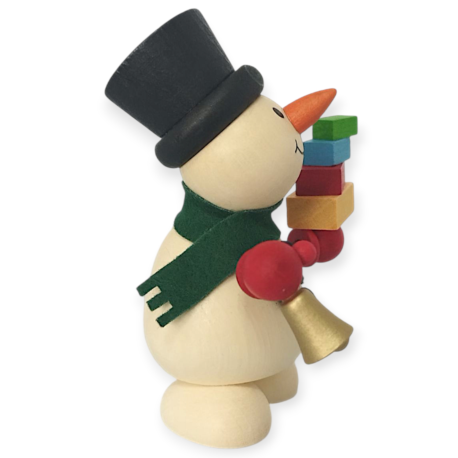In his right hand, the snowman holds a golden bell, creating a festive atmosphere. With his left hand, he artfully balances four colorful gift packages. The bottom package is bright yellow, followed by a red one, then a light blue one, and on top, a small green one. The packages create a cheerful effect and add color to the scene. Each individual gift is carefully varnished and blends harmoniously into the overall picture.