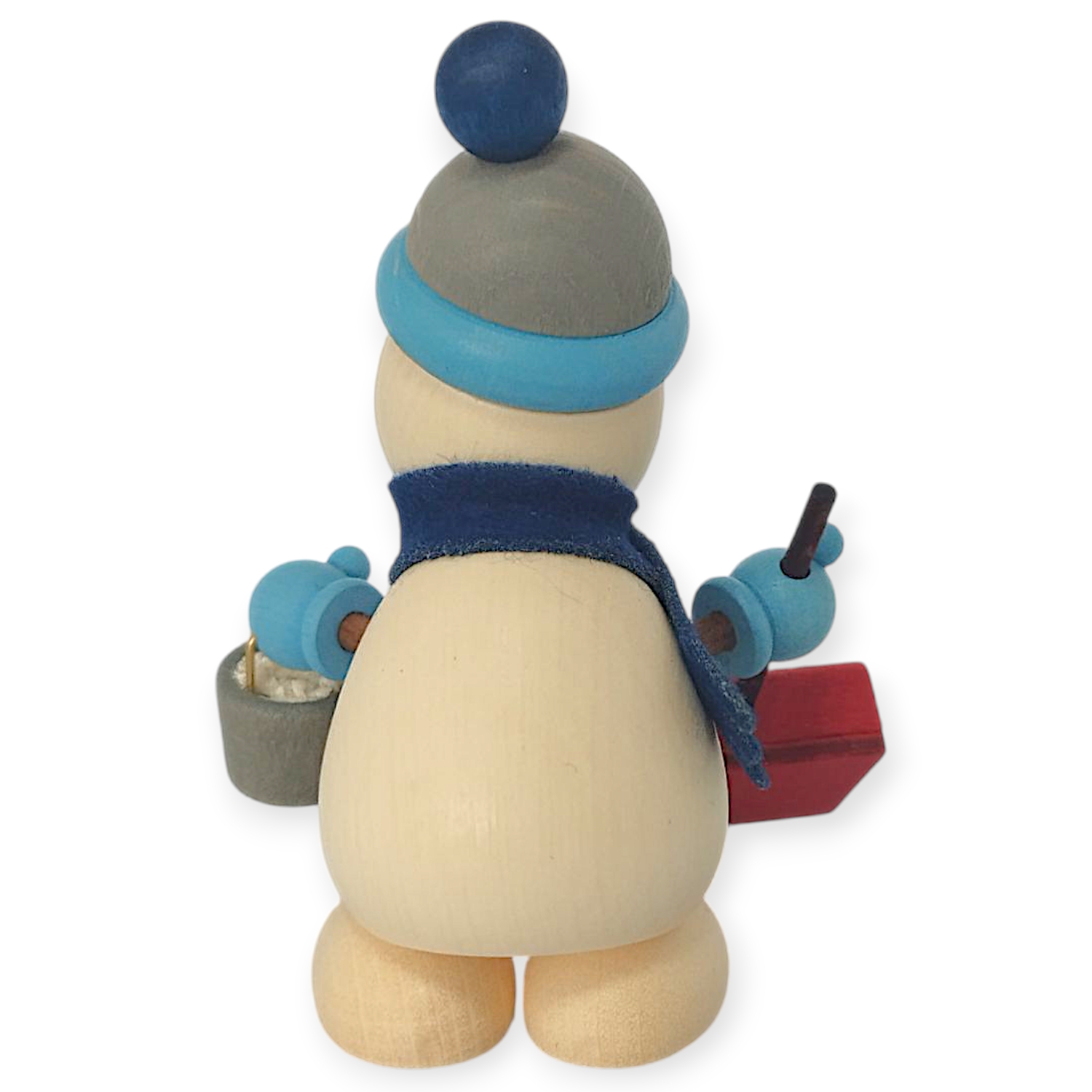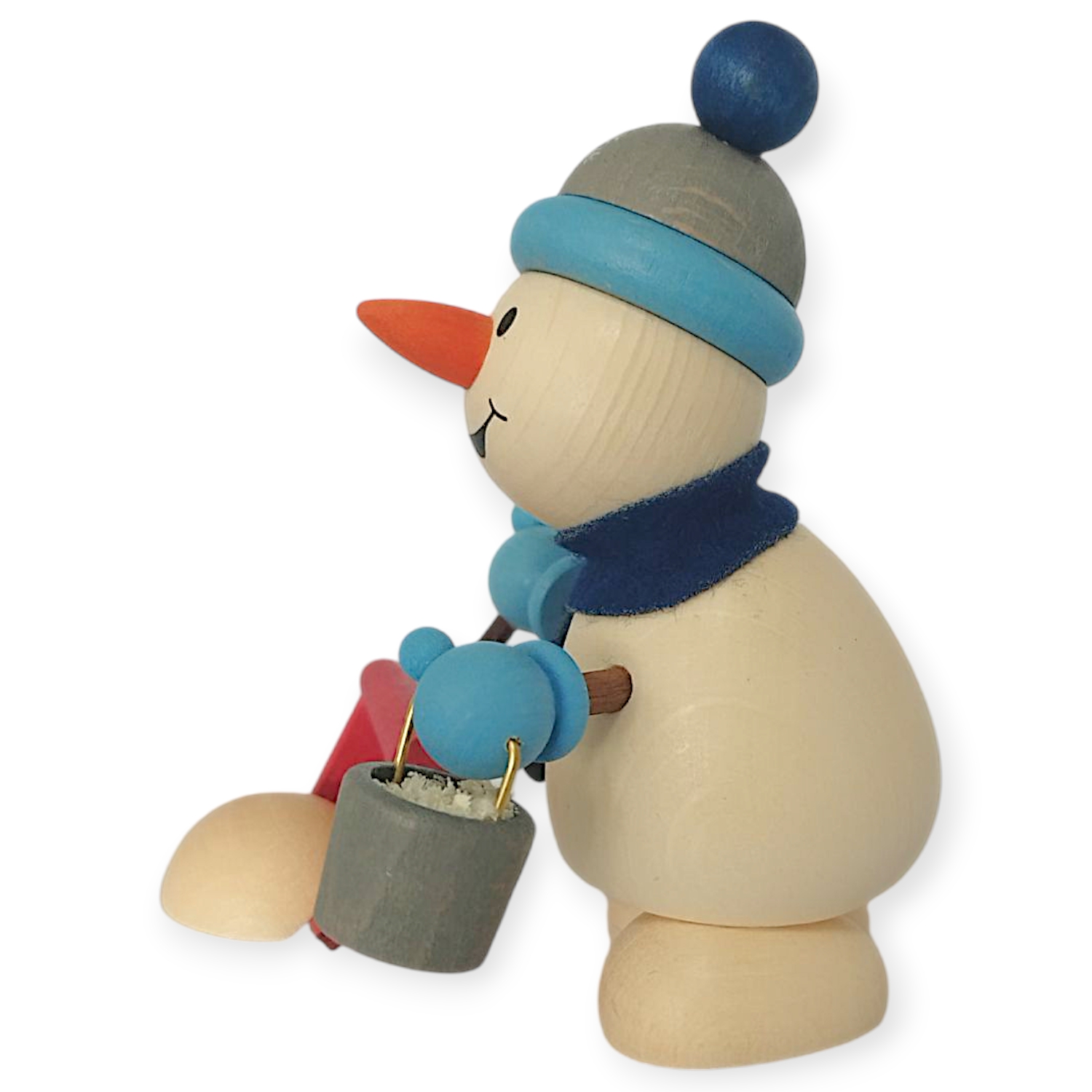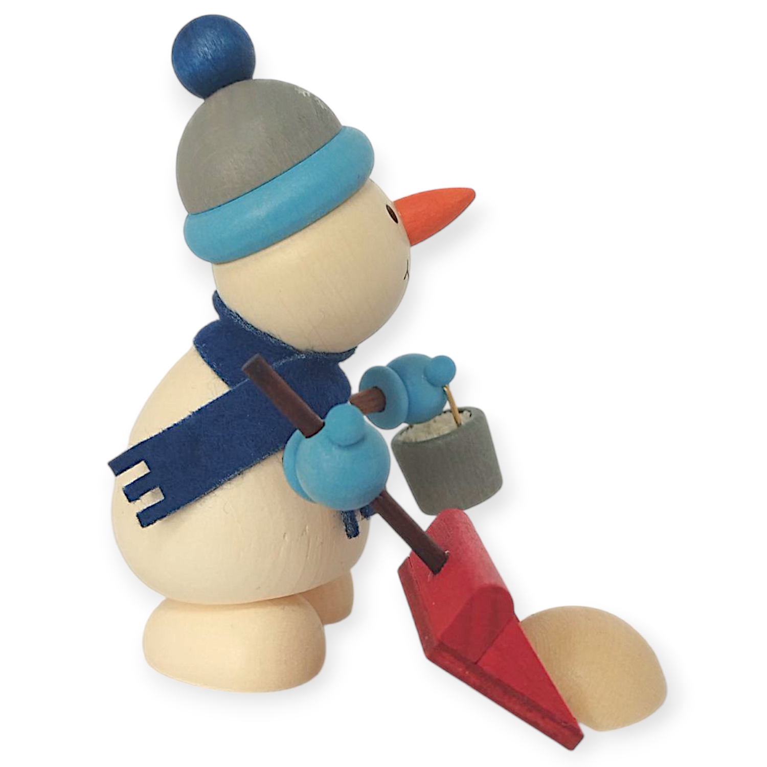 In his right hand, the snowman holds a large red snow shovel with which he is currently pushing a pile of snow. In his left hand, he carries a gray bucket filled with road salt. These accessories lend the decorative snowman a lively character.