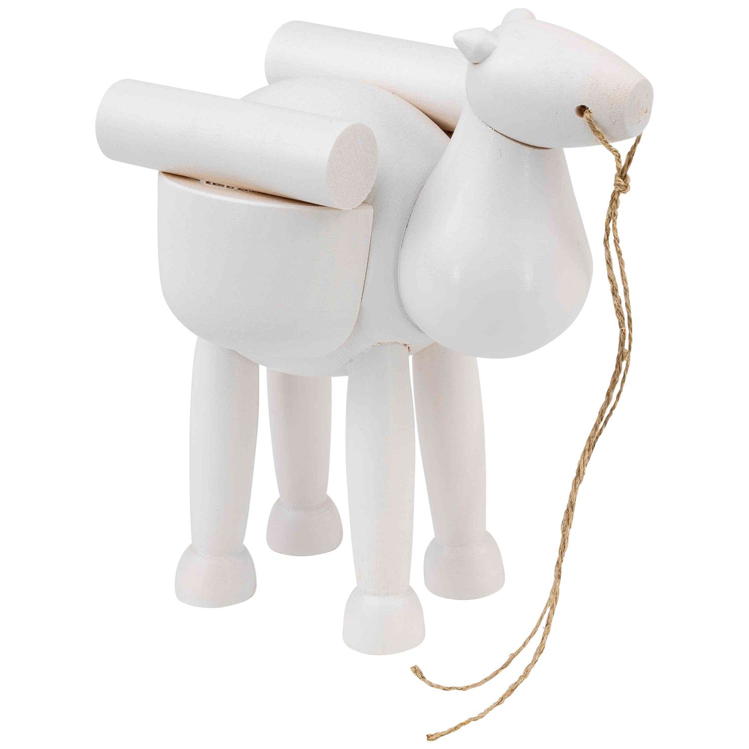 The figure measures approximately ten centimeters in height and is meticulously handcrafted from fine wood. The flawless white lacquer highlights the flowing contours and stable proportions, lending it a pure, almost meditative presence. Superfluous details are omitted; the effect unfolds through harmonious forms and serene posture. This camel fits seamlessly into minimalist modern decor as well as traditional nativity scenes.