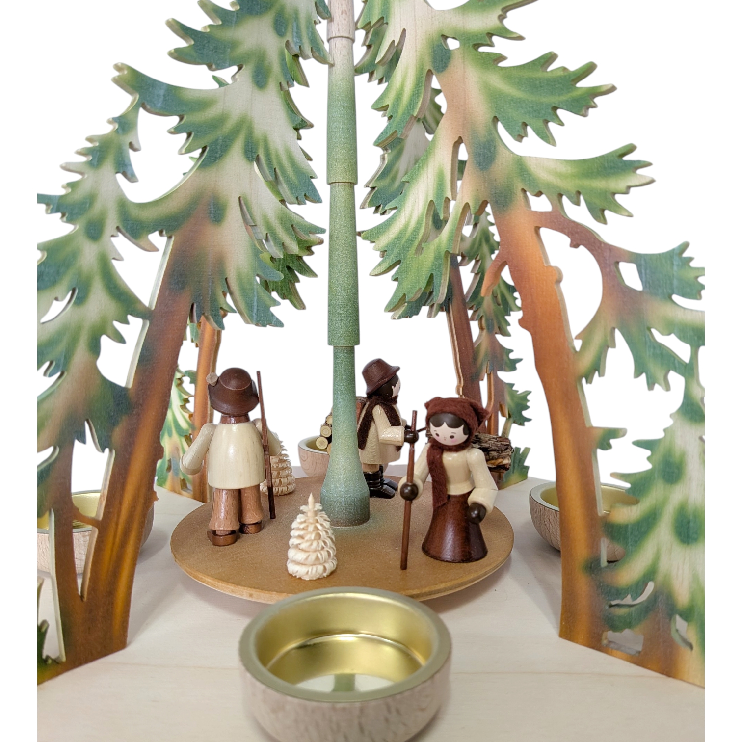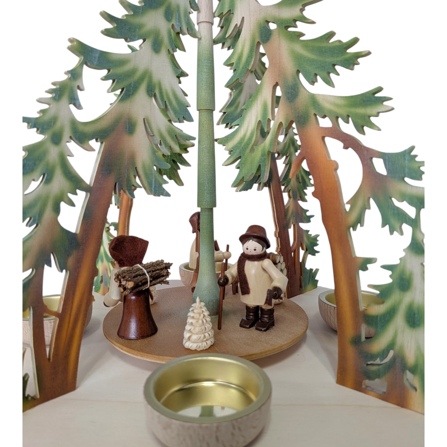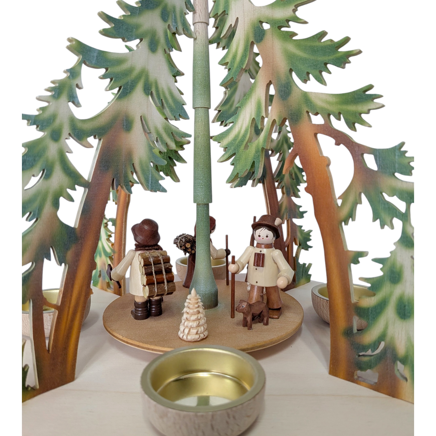 The centerpiece of the pyramid is an evocative forest scene. Lovingly hand-carved woodcutter figures rotate around the natural wood-framed central post – including a log carrier with a bundle of brushwood on his back, a forester with a staff and his faithful dog, and other woodsmen depicted in typical Erzgebirge style. Small, turned fir trees add further life to the scene. Together, they tell a story from the winter forest.