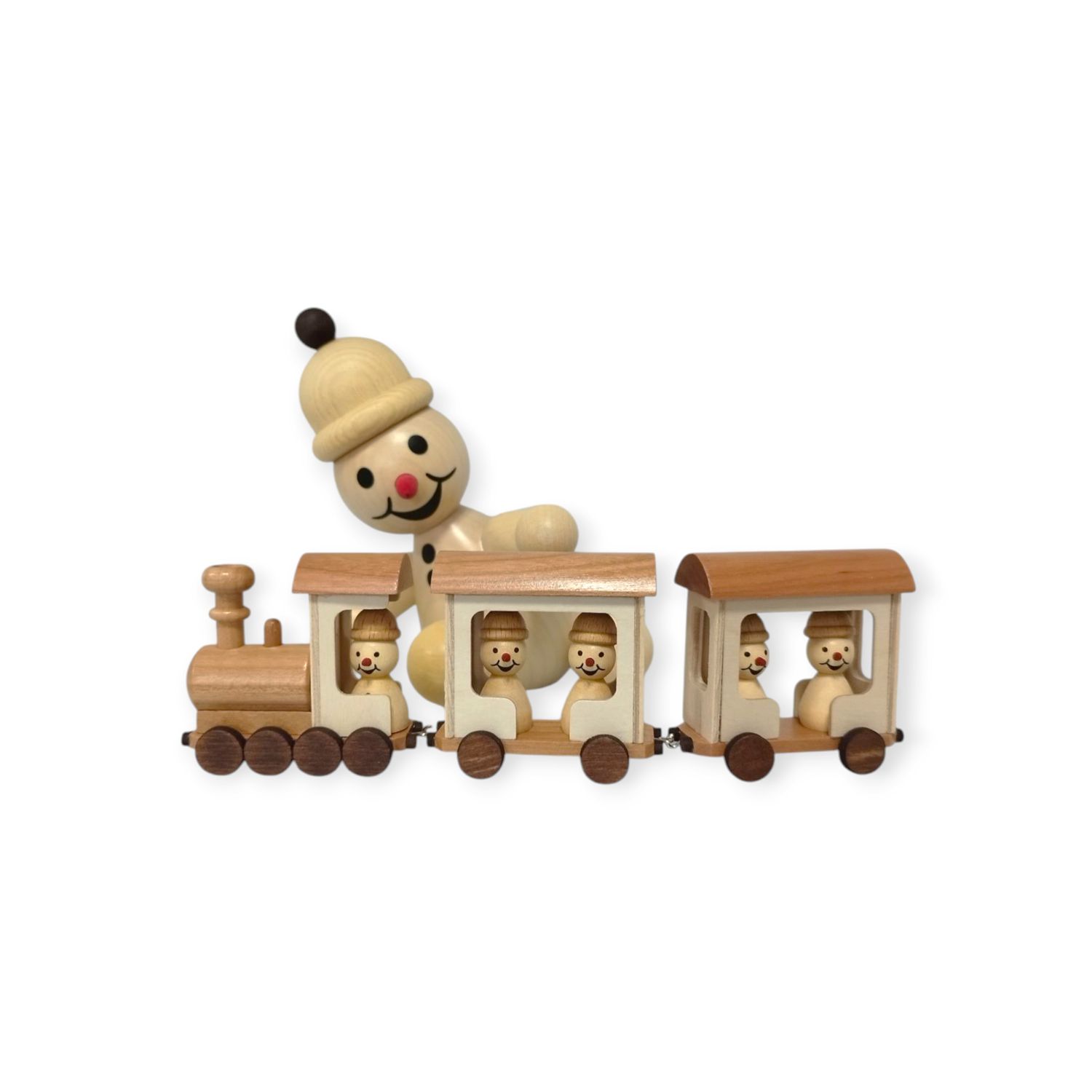 The wagon set of 2 is the perfect addition to item 436, the snowman junior with locomotive, medium. This charming set consists of two wooden wagons, each of which has space for two small snowmen. The snowmen, lovingly made from light wood, have friendly faces with red carrot noses, broad smiles and black button eyes. Their hats, also made of wood, harmoniously round off their cute appearance.