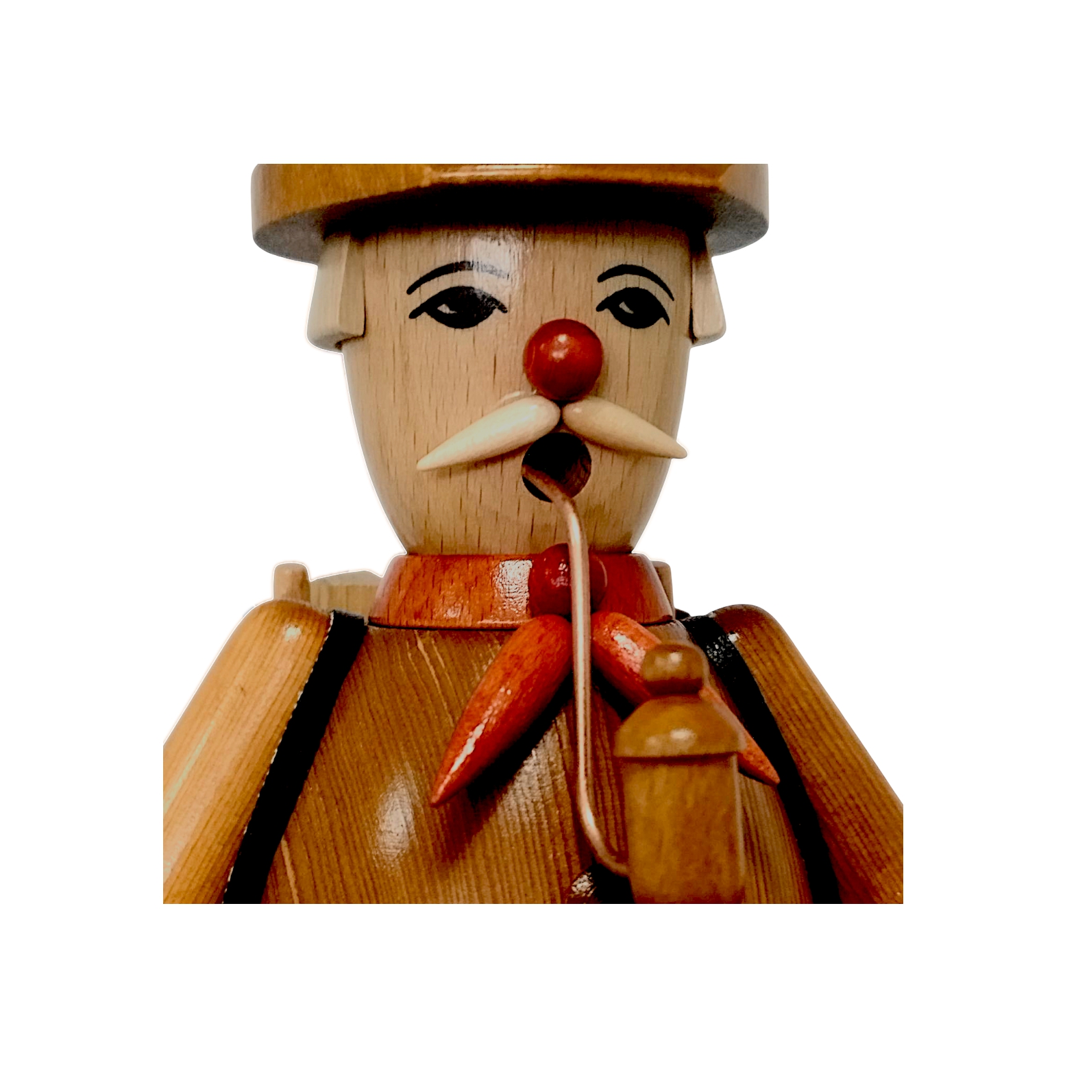 The lumberjack’s face radiates friendliness. His red nose and mustache give him character. A long pipe is stuck in his mouth. This pipe serves not only as decoration, but also allows the smoke to rise during incense burning.