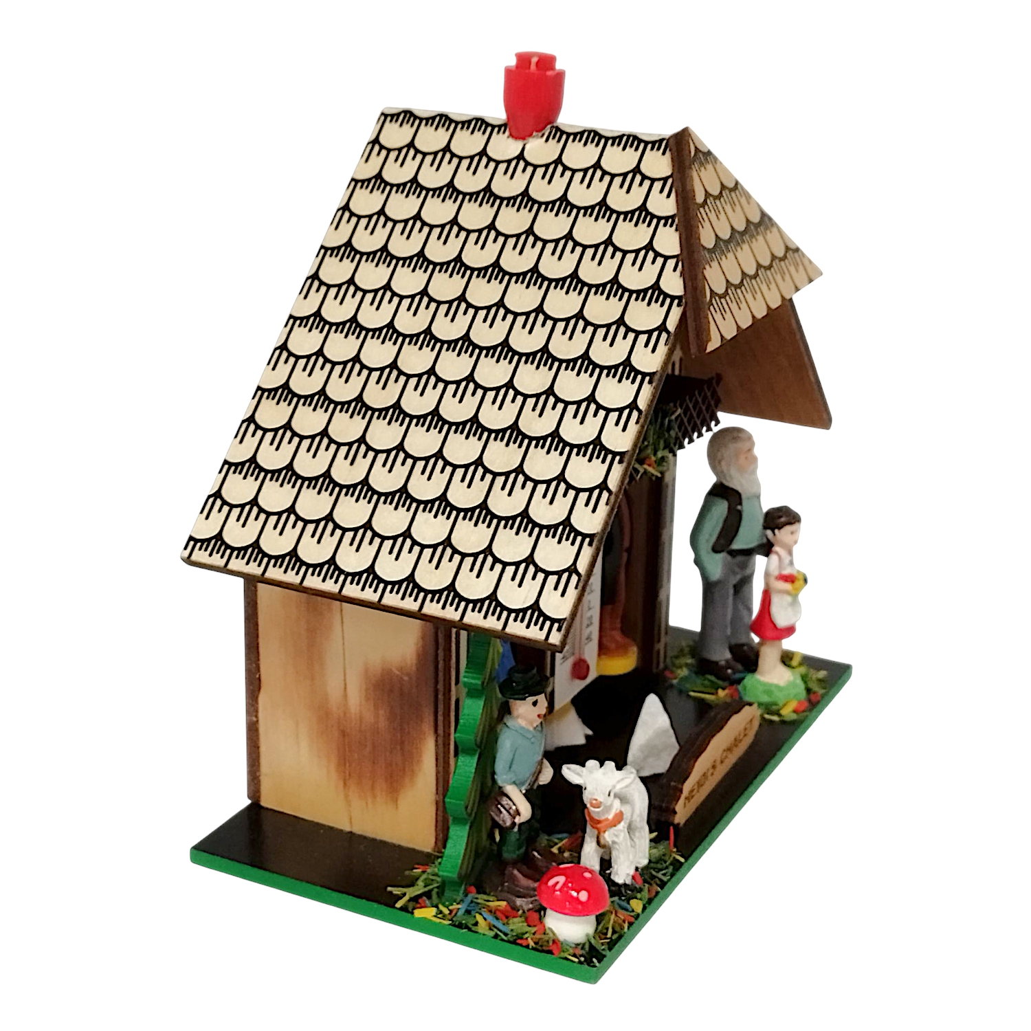 Standing right next to the house are Heidi and her grandfather. Both figures are intricately designed and reflect the warmth and family spirit of the famous story. The colors of their clothing are carefully chosen and perfectly match the surroundings of the house. On the opposite side, you can see Peter and his faithful goat. These figures also impress with their delicate painting and authentically capture the rural flair of the Alpine world. These little highlights make the weather house something truly special, as they combine tradition and childlike imagination.