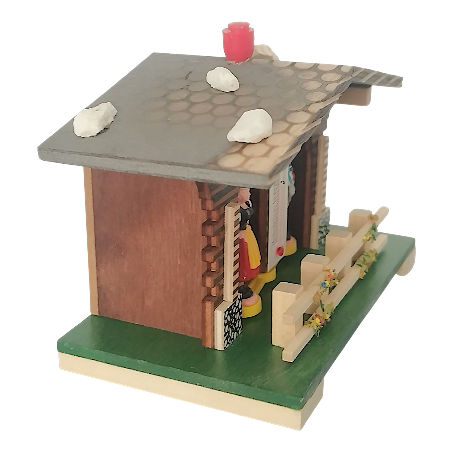 The front is adorned with a detailed wooden fence, complemented by small, brightly painted flower boxes. This decorative element underscores the traditional character of the weather house and gives it a warm, inviting touch. The sturdy wood, the precise embellishments, and the vibrant colors make this product an attractive eye-catcher on any windowsill or in the entrance area.