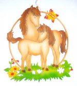 A big and a small horse on a green meadow, on the edge the flowers are blooming, in the sky a colorful butterfly.